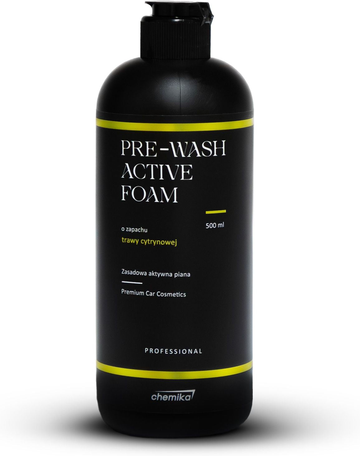 Aktywna piana do mycia samochodów CHEMIKA Pre-Wash Active Foam 500ml CHEMIKA Pre-Wash Active to wysokiej jakości aktywna piana do mycia samochodu i preparat do mycia karoserii, skutecznie usuwająca nawet najcięższe zabrudzenia. Dzięki świeżemu zapachowi trawy cytrynowej zapewnia przyjemność użytkowania oraz doskonałe efekty czyszczenia. Uniwersalne zastosowanie Produkt można zastosować do czyszczenia wielu miejsc w samochodzie: Karoseria Szkło Metal Aluminium Wysoka koncentracja, niższe koszty Aktywna piana do mycia samochodów firmy CHEMIKA cechuje się wyższą koncentracją na tle konkurencji, na poziomie 1:50, dzięki czemu używasz tyle płynu ile potrzebujesz, co przekłada się oszczędność pieniędzy. Skuteczność w trudnych warunkach atmosferycznych Formuła CHEMIKA Pre-Wash Active Foam została zoptymalizowana tak, aby zapewniać niezawodne działanie nawet w niskich temperaturachi podczas wietrznej pogody. Niezależnie od warunków, aktywna piana utrzymuje swoją strukturę i nie opada, gwarantując skuteczne czyszczenie. Sposób stosowania Przed użyciem wstrząsnąć Koncentrat rozcieńczyć w proporcji: Pianownica PA - od 1:2 do 1:20 Pianownica ręczna - od 1:10 do 1:50 Napełnić pojemnik roztworem Pianę należy zmyć, kiedy przestaje być puszysta i powoli spływa z lakieru Przy stosowaniu jako aktywna piana posługiwać się wyłącznie urządzeniami do wytwarzania piany. W przypadku mycia elementów plastikowych najlepsze rezultaty uzyskuje się przez naniesienie roztworu na czyszczony element przy pomocy natrysku pompką lub urządzeniem ciśnieniowym i czyszczenie gąbką, szmatką. Przeciwwskazania Nie dopuścić do wyschnięcia preparatu na powierzchni. Nie aplikować na rozgrzaną powierzchnię. Nie czekaj! Kup CHEMIKA Pre-Wash Active Foam i ciesz się pięknem swojego samochodu! Nie czekaj! Kup CHEMIKA Pre-Wash Active Foam i ciesz się pięknem swojego samochodu! CHEMIKA PRE-WASH ACTIVE FOAM to wysokiej jakości skoncentrowany preparat do usuwania ciężkich zabrudzeń. Charakteryzuje się trwałą, gęstą pianą o znakomitej przyczepności do mytej powierzchni o przyjemnym zapachy trawy cytrynowej.