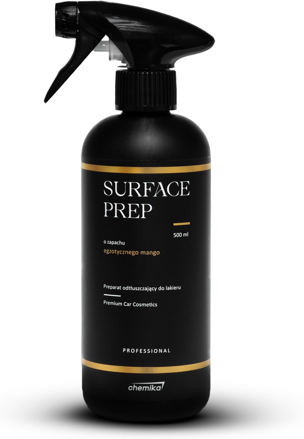 CHEMIKA Surface Prep 500ml Preparat do odtłuszczania lakieru samochodowego CHEMIKA Surface Prep służy do usuwania pozostałości po pastach polerskich i przygotowuje powierzchnię do aplikacji wosku, powłok ochronnych oraz sealantu. Jego formuła nie pozostawia na lakierze smug i zapewnia przyjemny zapach egzotycznego mango. Bezpieczny dla samochodu Odtłuszczacz do lakieru CHEMIKA Surface Prep jest bezpieczny dla powierzchni lakieru, nie powodując mikrouszkodzeń ani odbarwień, co gwarantuje jego skutecznośćbez ryzyka uszkodzenia. Gotowy do użycia Produkt jest gotowy do użycia, nie wymaga rozcieńczania co przyspiesza pracę nad samochodem. Łatwość użytku Odtłuszczacz do samochodu CHEMIKA Surface Prep będzie idealnym wyborem dla użytkowników indywidualnych dbających o swój samochód. Środek nie wymaga profesjonalnych narzędzi do jego używania, czyni go łatwym do stosowania. Sposób stosowania Nie rozcieńczać i nie aplikować na rozgrzaną powierzchnię Rozpylić preparat na czystą, suchą mikrofibrę przetrzeć czyszczony obszar i wypolerować, aż do całkowitego odparowania produktu Nie czekaj! Zamów CHEMIKA Surface Prep już dziś i zadbaj o swój samochód jak profesjonalista! Nie czekaj! Zamów CHEMIKA Surface Prep już dziś i zadbaj o swój samochód jak profesjonalista! CHEMIKA SURFACE PREP to preparat do usuwania pozostałości po pastach polerskich, przygotowuje powierzchnię do aplikacji wosku, powłok i sealantu.