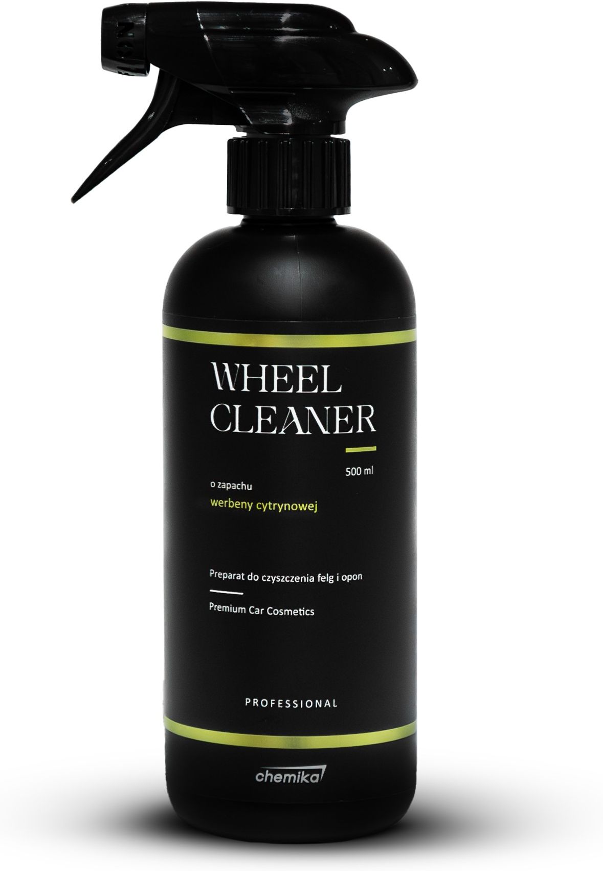 Płyn do mycia felg i opon CHEMIKA Wheel Cleaner 500ml CHEMIKA Wheel cleaner to preparat do mycia felg i opon o przyjemnym cytrynowym zapachu. Posiada mocne właściwości czyszczące, pozostawiając opony i felgi dogłębnie wyczyszczone. Wysoka siła czyszcząca Nasz produkt dzięki alkalicznej formule skutecznie usuwa osady z drogowych pyłów hamulcowych, smarów i pozostałości po starych dressingach. Dodatkowo przygotowuje powierzchnię na użycie naszego dressingu do opon CHEMIKA Tire Gloss Dressing. Unikalna receptura pieniąca W odróżnieniu od konkurencji, preparat do mycia felg i opon CHEMIKA tworzy stabilną pianę, która przykleja i utrzymuje się do pionowych powierzchniach felg i long-travel nadkoli. Dzięki temu brud jest skutecznie rozpuszczany, a czyszczenie staje się bardziej efektywne. Uniwersalne zastosowanie CHEMIKA Wheel Cleaner można użyć na felgach stalowych, aluminiowych, nadkolach, oponach a nawet gumowych dywanikach. Sposób użycia Tylko do użytku zewnętrznego. Nie rozcieńczać i nie aplikować na rozgrzaną powierzchnię. Spłukać z kół luźny brud za pomocą myjki ciśnieniowej. Spryskać produkt za pomocą atomizera bezpośrednio na felgi i opony. W przypadku silnych zabrudzeń użyć szczotki lub pędzelka. Spłukać wodą pod ciśnieniem. Warunki podczas użytkowania Przed użyciem zapoznać się z etykietą znajdującą się na opakowaniu. Chronić przed dziećmi. W przypadku dostania się do oczu płukać wodą przez kilka minut. Wyjąć soczewki kontaktowe, o ile nie są przyklejone do oka. Kontynuować płukanie. W razie połknięcia, niepożądanych reakcji alergicznych, zmian skórnych skonsultować się z lekarzem i pokazać mu etykietę lub Kartę Charakterystyki produktu. Nie czekaj! Kup Płyn do mycia felg i opon CHEMIKA Wheel Cleaner i ciesz się czystymi felgami i oponami już dzisiaj! Nie czekaj! Kup Płyn do mycia felg i opon CHEMIKA Wheel Cleaner i ciesz się czystymi felgami i oponami już dzisiaj! WHEEL CLEANER to zasadowy produkt przeznaczony do szybkiego i skutecznego czyszczenia kół i opon. Siła czyszcząca oddziela nawet najbardziej uporczywe zabrudzenia, pozostawiając felgi i opony dogłębnie doczyszczone.