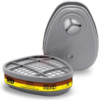 Pochłaniacz zgodny z EN 14387Pochłniacz X702 A1E1 jest produktem wielokrotnego użytku do półmasek i masek dwufiltrowych. Pochłaniacz X702 A1E1 ze złączem bagnetowym, chroni przed organicznymi parami i gazami, o temperaturze wrzenia powyżej 65°C (kolor brązowy), dwutlenkiem siarki oraz parami i gazami kwaśnymi (kolor żółty) przy stężeniu objętościowym w powietrzu nie przekraczającym 0,1%. Konstrukcja odchylna do tyłu zapewnia lepsze pole widzenia. Pochłaniacz X702 A1E1 posiada złącze bagnetowe pozwalające na łączenie z półmaskami serii X6 i X7 oraz maskami pełnotwarzowymi serii X8.Ograniczenia i przechowywanieNie używać w środowisku, w którym stężenie tlenu jest mniejsze niż 19,5% oraz w obecności nieznanych gazów. Przechowywać w oryginalnym opakowaniu wraz z instrukcją, bez podłączonych elementów oczyszczających w temperaturze od -20°C do +30°C i wilgotności RH<80%. Chronić przed bezpośrednim działaniem światła słonecznego.