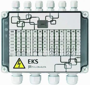 Element EKS-6040 wyposażony w 4 wejścia niskonapięciowe. Uniwersalne elementy kontrolno-sterujące EKS-6000 są elementami adresowalnymi, przeznaczonymi do: sterowania automatycznych urządzeń zabezpieczających, przeciwpożarowych kontroli zadziałania ww. urządzeń kontroli stanu dowolnych urządzeń. Wyjścia przekaźnikowe elementów EKS-6000 mogą być zastosowane zarówno przy sterowaniu napięciem 24 VDC (max 60 W) jak i 230 VAC (max 62,5 VA). Ponadto EKS-6000 w wersji 6222P ma możliwość sterowania dużymi mocami (12 A przy 230 VAC). Wejścia niskonapięciowe (NN) elementu EKS-6000 umożliwiają podłączenie niezależnych, bezpotencjałowych zestyków normalnie zwartych albo normalnie rozwartych. Wejścia wysokonapięciowe (WN) elementu EKS-6000 umożliwiają podłączenie niezależnych, zestyków przy napięciu do 230 VAC lub 220 VDC. Element przystosowany jest do pracy wewnątrz i na zewnątrz obiektów. Element kontrolno-sterujący EKS-6000 przewidziany są do pracy w adresowalnych liniach dozorowych central sygnalizacji pożarowej POLON 6000. Elementy kontrolno-sterujące EKS-6000 dostępne są w siedmiu odmianach konfiguracyjnych oznaczonych tak jak podano poniżej: 1. EKS-6040 - wyposażony w 4 wejścia niskonapięciowe, 2. EKS-6004 - wyposażony w 4 wyjścia, 3. EKS-6022 - wyposażony w 2 wejścia niskonapięciowe, 2 wyjścia, 4. EKS-6044 - wyposażony w 4 wejścia niskonapięciowe, 4 wyjścia, 5. EKS-6202 - wyposażony w 2 wejścia wysokonapięciowe, 2 wyjścia, 6. EKS-6400 - wyposażony w 4 wejścia wysokonapięciowe, 7. EKS-6222P - wyposażony w 2 wejścia niskonapięciowe, 2 wejścia wysokonapięciowe i 2 wyjścia sterujące dużej mocy (12A/230 VAC). Typ Elementy monitorujące Obciążenie linii dozorowej w zależności od wybranego trybu pracy 210µA Liczba wejść kontrolnych 4 Inicjacja wejścia kontrolnego styk bezpotencjałowy NO lub NC