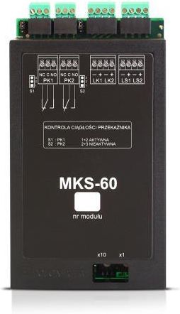 Moduł MKS-60 realizuje funkcje: sygnalizacji optycznej, sygnalizacji akustycznej, diagnostyki, wizualizacji stanów centrali. Moduł posiada: - 2 wyjścia przekaźnikowe bezpotencjałowe bistabilne, - 2 wyjścia potencjałowe (LS), - 2 wejścia linii kontrolnych. Układ sterowania przekaźnikami wyposażono w funkcję umożliwiającą zaprogramowanie bezpiecznej pozycji styków w przypadku zaniku zasilania, tzw. stanu bezpiecznego (fail-safe). Każde wyjście przekaźnikowe zawiera układ kontroli ciągłości, który można wł./wył. za pomocą zworek S1, S2. Wyjścia potencjałowe wyposażono w układ nadzorowania pozwalający wykryć przerwę, zwarcie oraz przeciążenie dołączonych linii.