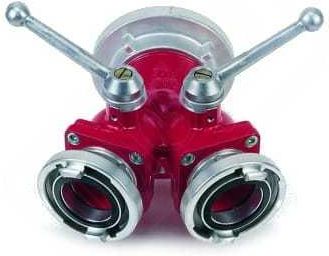 Rozdzielacze kulowe służą do rozdzielania strumienia wody z głównej części linii wężowej 75 na dwie linie 52. Wyloty rozdzielacza są wyposażone w niezależne zawory kulowe służące do zamknięcia przepływu. Na wlocie i wylotach znajdują się nasady służące do podłączenia linii wężowych. Dane techniczne: Ciśnienie robocze - 0,6-1,6 MPa Szczelność - 1,8 MPa Materiały: odlewy aluminiowe ze stopu AK 11 (AlSi 11), mosiądz MO 58, uszczelki - guma. Masa - ok. 2,5 kg