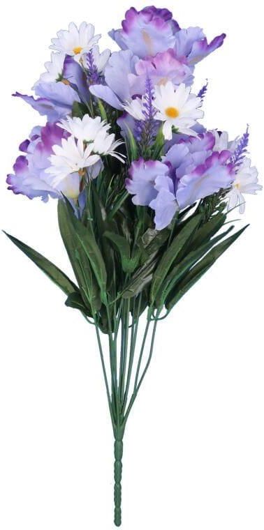 Piękny bukiet sztucznych irysów, wykonany z wysokiej jakości materiałów, które sprawiają, że kwiaty wyglądają niemal jak żywe. Doskonale sprawdzi się jako samodzielna dekoracja lub jako część większej kompozycji kwiatowej. Idealny do ozdoby salonu, sypialni czy biura, wprowadzając elegancję i świeżość do wnętrza. Bukiet utrzymuje piękny wygląd przez długi czas, nie wymagając pielęgnacji. Subtelne dodatki podkreślają naturalny charakter aranżacji. Wielkość: 50 cm.