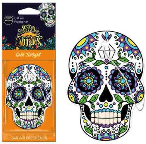GOLD TATTOO Zawieszka zapachowa do auta AROMA Car Dia De Los Muertos Gold Twilight Celulozowy odświeżacz powietrza w formie zawieszki nasączony płynną kompozycją zapachową. Fantazyjne wzory nadrukowane na produkcie przeniosą nas w świat upiorów i demonów. Należy tylko zawiesić detal celulozowy na …