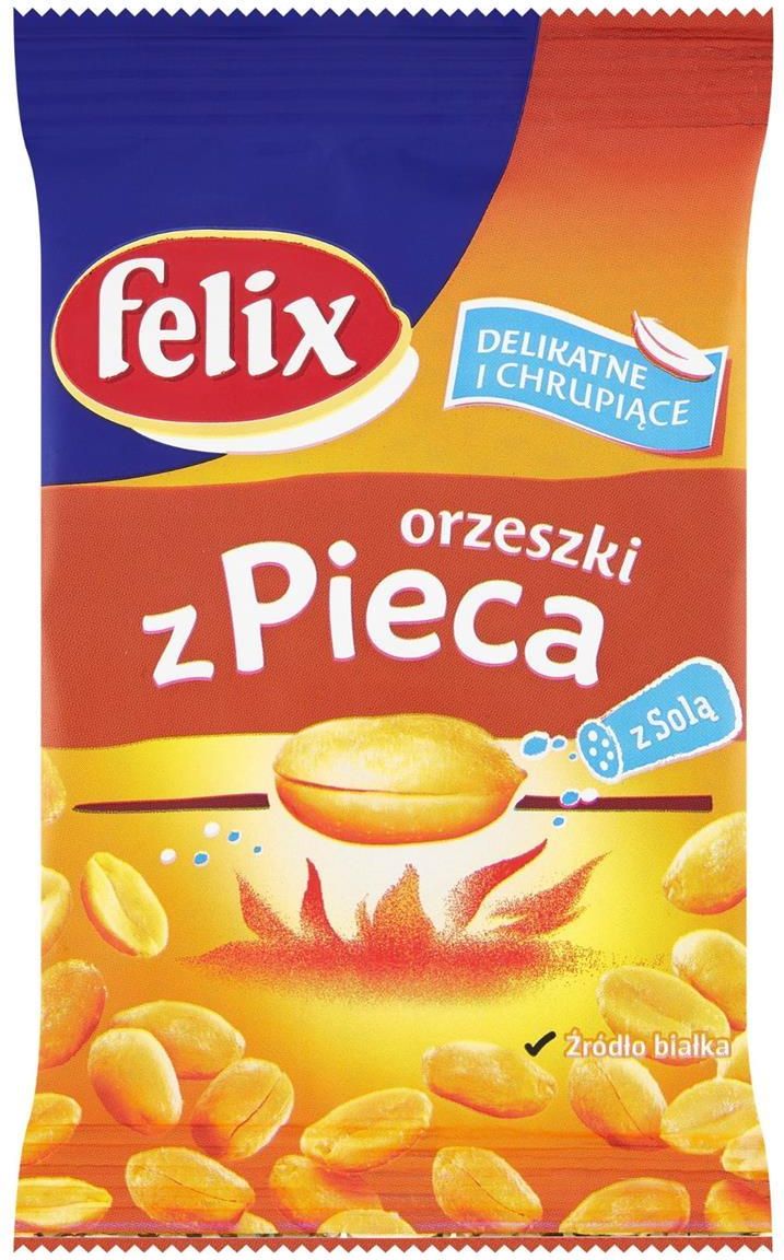 Felix Orzeszki z Pieca z solą 70 g Orzeszki ziemne dwukrotnie prazone i solone. Delikatne i chrupiące. orzeszki ziemne (97%), sól (1,5%), substancja żelująca: guma arabska, maltodekstryna, cukier karmelizowany, ekstrakt z drożdży