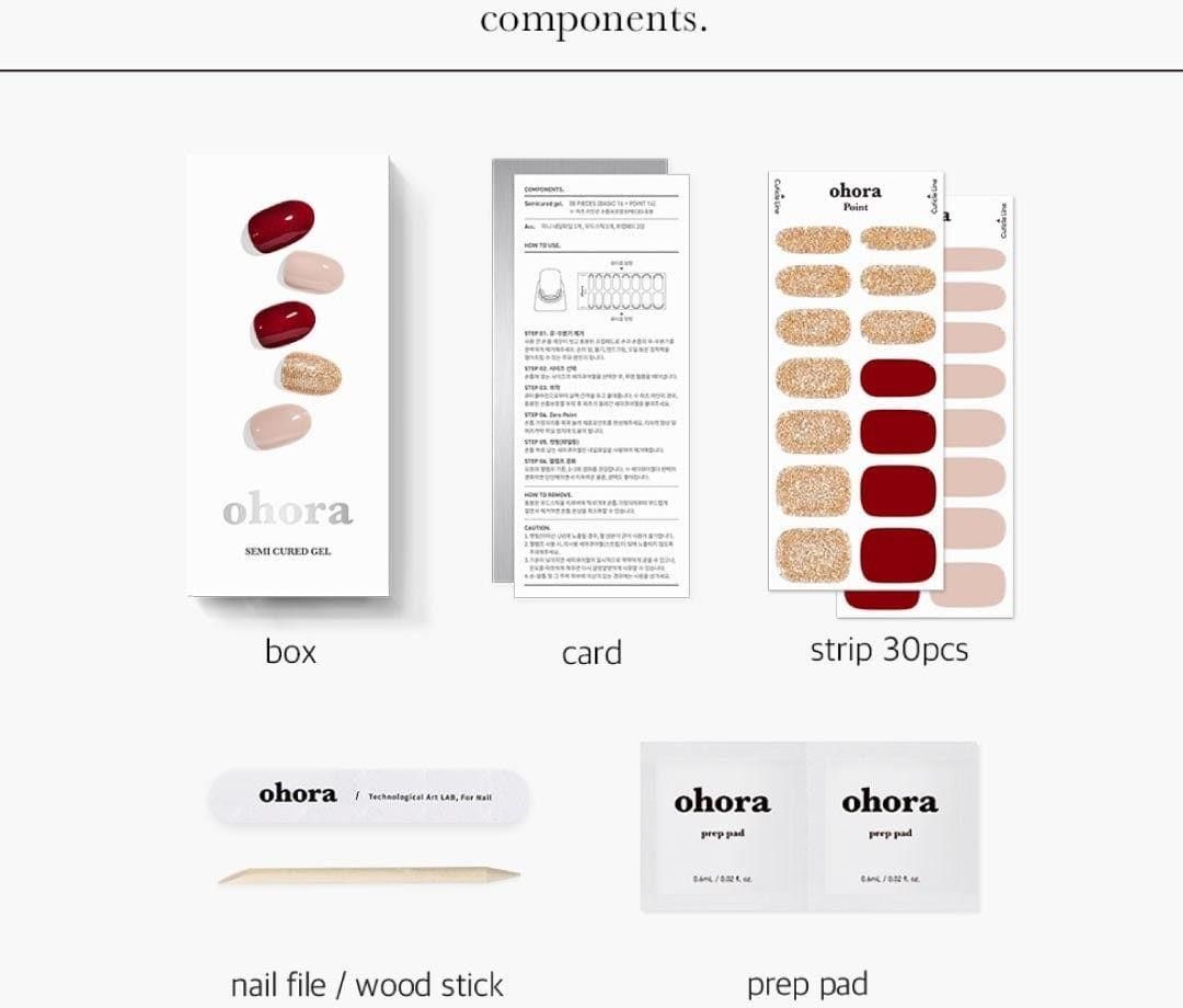 OHORA Lakier hybrydowy w naklejce - Rosewood 1op-30szt Elegancja Rosewood to idealne połączenie klasycznej estetyki z nutą nowoczesności. Ten wyjątkowy kolor został stworzony z myślą o kobietach, które pragną podkreślić swoją indywidualność i wyróżnić się w tłumie. Głęboki burgund, przypominający dojrzałe wiśnie w letni wieczór, dodaje paznokciom zmysłowości i wyrazistości. To kolor symbolizujący pasję, siłę oraz pewność siebie. Jego ciepły odcień doskonale współgra z delikatnym beżem, który wprowadza subtelność i lekkość. Beżowa tonacja nadaje całości naturalności, sprawiając, że zestawienie jest uniwersalne i idealne zarówno na codzienne wyjścia, jak i na bardziej eleganckie okazje. Instrukcja użycia Krok 1: Przygotowanie paznokci Dokładnie umyj ręce. Użyj płatka kosmetycznego, aby odtłuścić paznokcie. Upewnij się, że na paznokciach nie ma wilgoci, olejów ani kremów, ponieważ mogą one zmniejszyć przyczepność naklejek OHORA. Krok 2: Nakładanie naklejek Wybierz naklejkę odpowiednią do rozmiaru paznokcia i odklej przezroczystą folię. Sprawdź oznaczenia na arkuszu, aby nakleić naklejki zgodnie z instrukcją. Nałóż naklejkę na paznokieć, pozostawiając niewielką przestrzeń między paskiem a skórką. Mocno dociśnij i wygładź naklejkę na paznokciu, używając drewnianego patyczka do dociśnięcia krawędzi. Krok 3: Przycinanie naklejek Przytnij naklejkę do długości paznokcia za pomocą cążków lub nożyczek. Nie przycinaj zbyt blisko paznokcia. Po utwardzeniu lampą UV można je wyrównać pilniczkiem. Krok 4: Utwardzanie paznokci Utwardź naklejki przez 40 sekund pod lampą UV OHORA. Czas utwardzania może się różnić w zależności od wzoru, wzory z kamykami ozdobnymi będą wymagały dłuższego czasu. Sprawdź, czy naklejki są całkowicie utwardzone. Dobrze utwardzony żel powinien gładko przylegać do paznokcia, co zwiększy połysk i trwałość. Użyj ponownie załączonego pilnika, aby wygładzić krawędzie i wykończyć paznokcie. Usuwanie Krok 1: Usuwanie naklejek OHORA Podważ krawędź naklejki drewnianym patyczkiem i nałóż kilka kropli OHORA Easy Peel off remover lub zmywacza do paznokci. Poczekaj 30 sekund, aż płyn wniknie pod naklejkę. Możesz również zanurzyć paznokcie na minutę w pojemniku z niewielką ilością zmywacza. Delikatnie podważ patyczkiem naklejkę, aby ją w całości odkleić od paznokcia, robiąc to ostrożnie, aby nie uszkodzić paznokci. Krok 2: Usuwanie pozostałego kleju Użyj wacików lub chusteczek nasączonych roztworem acetonu, aby zetrzeć resztki kleju. Możesz również delikatnie użyć polerki kosmetycznej w pilniku, aby usunąć pozostałości kleju. Skład (INCI): Acrylate Copolymer Adhesive, Urethane Acrylate