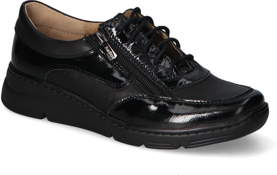 Stylowe półbuty popularnej marki Helios:- cholewka wykonana została ze skóry naturalnej licowej i lakierowanej - wnętrze pokryte zostało skórą naturalną aby zapewnić komfort podczas użytkowania - wkładka wewnętrzna wykonana została ze skóry naturalnej - sznurowanie i zamek błyskawiczny ułatwiają zakładanie i dopasowanie obuwia- podeszwa o grubości 3 cm zapewnia stabilizację - klasyczny czarny kolor oraz modny fason tworzą zachwycające połączenie!