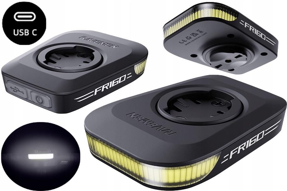 Lampka rowerowa przednia Ravemen FR160 czarna Lampa Przód Ravemen FR160 Black 160 lumenów FR160 to lekka i łatwa w użyciu lampka rowerowa do jazdy dziennej. Dzięki wysokowydajnym diodom LED COB (maks. 160 lumenów) i specjalnej konstrukcji przyciągającego wzrok ostrzegawczego trybu migania, znacznie zwiększa widoczność rowerzystów podczas jazdy w ciągu dnia. Lampka jest kompaktowa i kompatybilna z uchwytami do komputerów Garmin/Wahoo. Jest odporna na silny deszcz IPX6 i wyposażona w port ładowania typu C. Cechy produktu: Wysoce wydajne diody LED COB o maksymalnej jasności 160 lumenów. Przyciągający wzrok błysk ostrzegawczy do jazdy w dzień i wiele poziomów jasności dla różnych warunków jazdy. Kompatybilność z komputerami Garmin i uchwytami rowerowymi Garmin (zwarty w zestawie). Port ładowania USB-C do łatwego ładowania lampki. Funkcja zapamiętywania ostatnio używanego trybu świecenia. Wodoodporność IPX6 na ulewny deszcz. Wkładka i uchwyt montażowy do komputerów i uchwytów Wahoo (sprzedawany oddzielnie). Specyfikacja techniczna: Model: FR160 Moc: 160 lumenów LED: COB LED Bateria: akumulator litowo-polimerowy 380 mAh/3,7 V Wymiary: 75mm (dł.)*57mm (szer.)*21mm (wys.) Waga: 55g - możliwe odchylenia Czas pracy - max. 13,5h (szczegóły w tabelce w zdjęciach) Widoczny w ciągu dnia ostrzegawczy tryb migania - Dzięki specjalnemu wzorowi migania, przyciągający wzrok ostrzegawczy tryb migania FR160 zapewni widoczność podczas jazdy w ciągu dnia; 3 tryby stałe i 3 tryby migania dla różnych sytuacji podczas jazdy. Szerokokątna soczewka z widocznością boczną - Zwiększa widoczność boczną podczas jazdy przez skrzyżowanie. Prosta i wszechstronna - Lampkę można zamontować między uchwytem rowerowym Garmin a komputerami. Wymienne części (sprzedawane oddzielnie) są również dostępne dla komputerów Wahoo, W przypadku komputerów i uchwytów Wahoo należy wymienić wkładkę i zakładkę montażową lampki. (Lampka NIE jest kompatybilna z mocowaniem Garmin TT do rowerów triathlonowych). Port ładowania USB-C - Odwracalne złącze do łatwego ładowania latarki bez potrzeby odwracania wtyczki w celu znalezienia właściwej orientacji. Wbudowany czerwony wskaźnik ładowania. Wodoodporność IPX 6 - Lampka może być używana podczas jazdy w deszczu. (Po naładowaniu należy upewnić się, czy zaślepka portu ładowania jest dobrze zamocowana). id: FR160