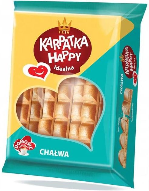 Karpatka Happy 500 g Pyszne kruche wafelki karpatka z nadzieniem o smaku chałwy. Idealne do kawy Odpowiednio wypieczony wafel , którego receptura została opracowana na bazie długoletniego doświadczenia i delikatny chałwowy krem, który rozpływa się w ustach. Pakowane luzem w kartonik. Produkt polskiej firmy FLIS - wspierajmy polskie. _____________________________ UWAGA !!! Produkt ten posiada co najmniej dwumiesięczny termin ważności, w innym przypadku poinformujemy o tym klienta przed nadaniem paczki. Karpatka jest tradycyjnym polskim ciastem. Bazując na zapisach pochodzących ze skryptu dla studentów filologii polskiej można przyjąć, że jego początki sięgają 1972 roku. Nazwa ciasta pochodzi od łańcucha górskiego - Karpat, za sprawą swojej pofałdowanej górnej części. Współczesna karpatka najczęściej składa się z dwóch warstw ciasta, pomiędzy którymi znajduje się znaczna ilość kremu. FLIS waga 1 op : 0,5kg Składniki: tłuszcz palmowy , cukier, miazga sezamowa 19,57%, mąka pszenna, mleko odtłuszczone w proszku, maka pszenna, częściowo skleikowana, serwatka ( z mleka) w proszku, skrobia ziemniaczana, tłuszcz kokosowy, laktoza (z mleka), jaja w proszku, emulgator: lecytyny (z rzepaku), sól, substancja spulchniająca (węglany sodu). może zawierać orzeszki arachidowe, inne orzechy, soję. Wartości odżywcze w 100g: wartośc energetyczna - 540kcal tłuszcz - 33g w tym kwasy tłuszczowe nasycone - 13g węglowodany - 49g w tym cukry - 26g białko - 11g sól - 0,38g