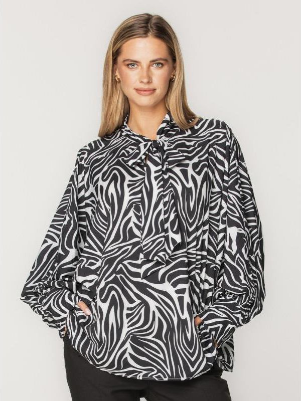 Bluzka damska oversize Oversizowa bluzka typu nietoperz to model, którego nie może zabraknąć w szafie stylowej kobiety. Elegancka, szykowna bluzka z wysokimi mankietami, dekoltem w literę V i wiązanym kołnierzem świetnie sprawdzi się w stylizacjach biznesowych, codziennych oraz okazjonalnych. Bluzkę można nosić zarówno w luźnej formie, jak i nadać jej intrygujący kształt za pomocą dowolnego paska. Kolor główny: czarno-biała zebra Tkanina: 100% satyna poliestrowa Gwarancja: 24 m-ce