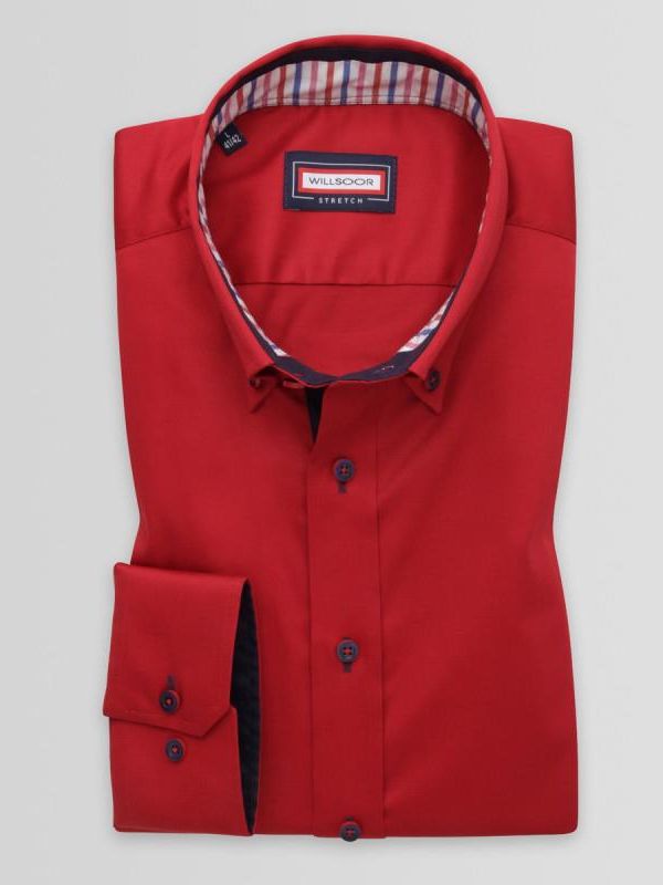 Czerwona taliowana koszula o gładkiej fakturze z podpinanym kołnierzykiem i granatowymi kontrastami, tkanina z dodatkiem elastanu