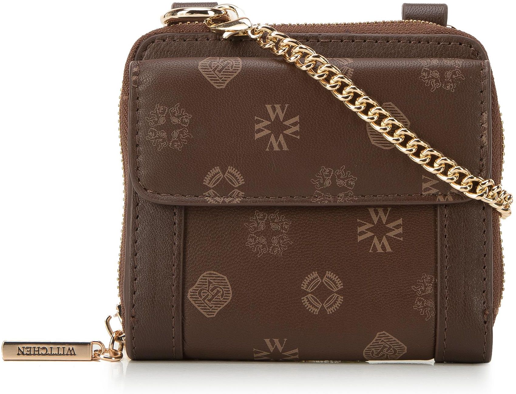 Mały damski portfel. Ten oryginalny portfel możesz nosić jak torebkę, dzięki doczepianemu, błyszczącemu łańcuszkowi. Wykonany został z wysokiej jakości skóry naturalnej w monogram WITTCHEN, więc jest to dodatek na lata. Blasku dodają mu złote okucia oraz łańcuszek, dzięki któremu całość zyskuje nowy charakter. Wewnątrz zmieścisz bilon oraz dwie karty, a do zewnętrznej kieszeni zapinanej na magnes schowasz na przykład bilet. Portfel możesz nosić na co dzień, a jako torebkę zabrać na wieczorne wyjście lub do kina. Damski portfel skórzany na łańcuszku przyda się każdej kobiecie lubiącej nieoczywiste dodatki.Nasza rada: to świetny pomysł na prezent dla nowoczesnej kobiety.Wewnątrz: podwójna otwarta kieszeń; 2 miejsca na karty kredytowe. Dodatkowo: 100% skóra naturalna; kieszeń z przodu zamykana na magnes; odpinany łańcuszek.