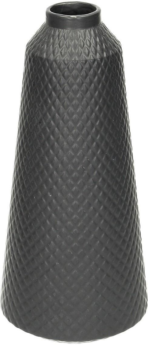 Wazon Velo 27 cm black, 12x27 cm Wazon z ceramiki z geometryczną strukturą w czarnym kolorze. Matowa czerń wazonu Velo to symbol wyrafinowanego stylu i nowoczesności, który doskonale odnajdzie się w przestrzeniach o loftowym lub industrialnym charakterze. Jego wyrazisty kolor kontrastuje z delikatnym geometrycznym wzorem, co sprawia, że wazon przyciąga uwagę zarówno jako samodzielna dekoracja, jak i element kompozycji z kwiatami o intensywnych barwach. Idealnie sprawdzi się w nowoczesnych aranżacjach, dodając wnętrzu odrobinę tajemniczości i klasy. Jego prostota w formie czyni go wszechstronnym dodatkiem do każdej przestrzeni. Wymiary: śr. 12 cm, śr. otworu 3 cm, wys. 27 cm. Materiał: ceramika. Dane produktu Waga: 0.60kg Rozmiar: 12x27 cm Materiał: ceramika Kolor: czarny