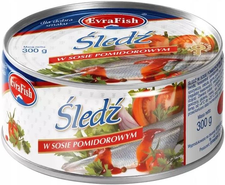 EvraFish ŚLEDŹ W SOSIE POMIDOROWYM konserwa PUSZKA EASY OPEN - 300 g Masz ochotę na rybną przekąskę? Chcesz, by Twoje ulubione kanapki nabrały niepowtarzalnego smaku? Wybierz Śledzia w sosie pomidorowym marki EvraFish i przekonaj się, jak smakuje jakość z polskich zakładów. Śledź w sosie pomidorowym EvraFish to połączenie mięsa śledzia złowionego w Morzu Bałtyckim. Ten najwyższej jakości rybny specjał z dodatkiem sosu pomidorowego i starannie dobranych przypraw to wspaniała propozycja na samodzielną potrawę, ciekawą przystawkę lub dodatek do kanapki, sałatki, a nawet pieczonego ziemniaka. Dzięki przemyślanej recepturze i restrykcyjnie selekcjonowanym składnikom Śledź w sosie pomidorowym EvraFish jest gotowy od razu do jedzenia! Nie potrzebujesz lodówki, żeby zabrać je ze sobą! Niewątpliwym plusem konserwy jest to, że nie zepsuje się jak wędlina czy ser, dlatego pakiet Śledź w sosie pomidorowym + pieczywo da Ci możliwość przygotowania na szybko świeżego posiłku. To poręczne opakowanie z wieczkiem typu easy open otworzysz w każdych warunkach! Możesz je śmiało wrzucić do plecaka - nie odczujesz jego wagi, a będziesz mieć pewność, że po długiej wędrówce zaspokoisz głód i dostarczysz organizmowi energii do kolejnych działań. Nie musisz się też martwić, że konserwa uwolni swoją zawartość do Twojego plecaka. Puszka jest naprawdę solidnie wykonana i niestraszne jej byle wstrząsy - została skonstruowana tak, by zachować szczelność w różnych warunkach. Idealne rozwiązanie w domu, podczas wyprawy czy obozowania przy ognisku. Pozycja wprost obowiązkowa dla miłośników aktywnej turystyki. Szczegółowe informacje Konserwa rybna / Żywność konserwowana / Żywność turystyczna / Opakowanie easy open / EvraFish Produkt: Śledź w sosie pomidorowym Masa netto: 300 g Składniki: 60% kawałki ze śledzia bez głowy i ogona [I - śledź bałtyckie (Clupea harengus membras złowiony w Morzu Bałtyckim, obszar połowu FAO 27.IIId, za pomocą włoków) lub II - śledź atlantycki (Clupea harengus, obszar połowu FAO 27, za pomocą włoków)], 40% sos pomidorowy: woda, 20% koncentrat pomidorowy, cukier, olej rzepakowy, skrobia modyfikowana, sól, cebula suszona, substancje zagęszczające: guma guar, guma ksantanowa; ekstrakty przypraw (zawierają seler), regulator kwasowości: kwas octowy. Może zawierać: gorczycę, gluten pszenny, mleko, soję. Opakowanie: puszka z wieczkiem typu easy open. Nie wymaga otwieracza. Konserwa: rybna, sterylizowana Przechowywanie: w suchym pomieszczeniu w temperaturze od +4°C do +25°C. Spożyć bezpośrednio po otwarciu. Wartość odżywcza w 100 g produktu Wartość energetyczna: 97 kcal Tłuszcz: 3,3 g w tym kwasy tłuszczowe nasycone: 0,6 g Węglowodany: 4,4 g w tym cukry: 4,7 g Białko: 12 g Sól: 1,1 g