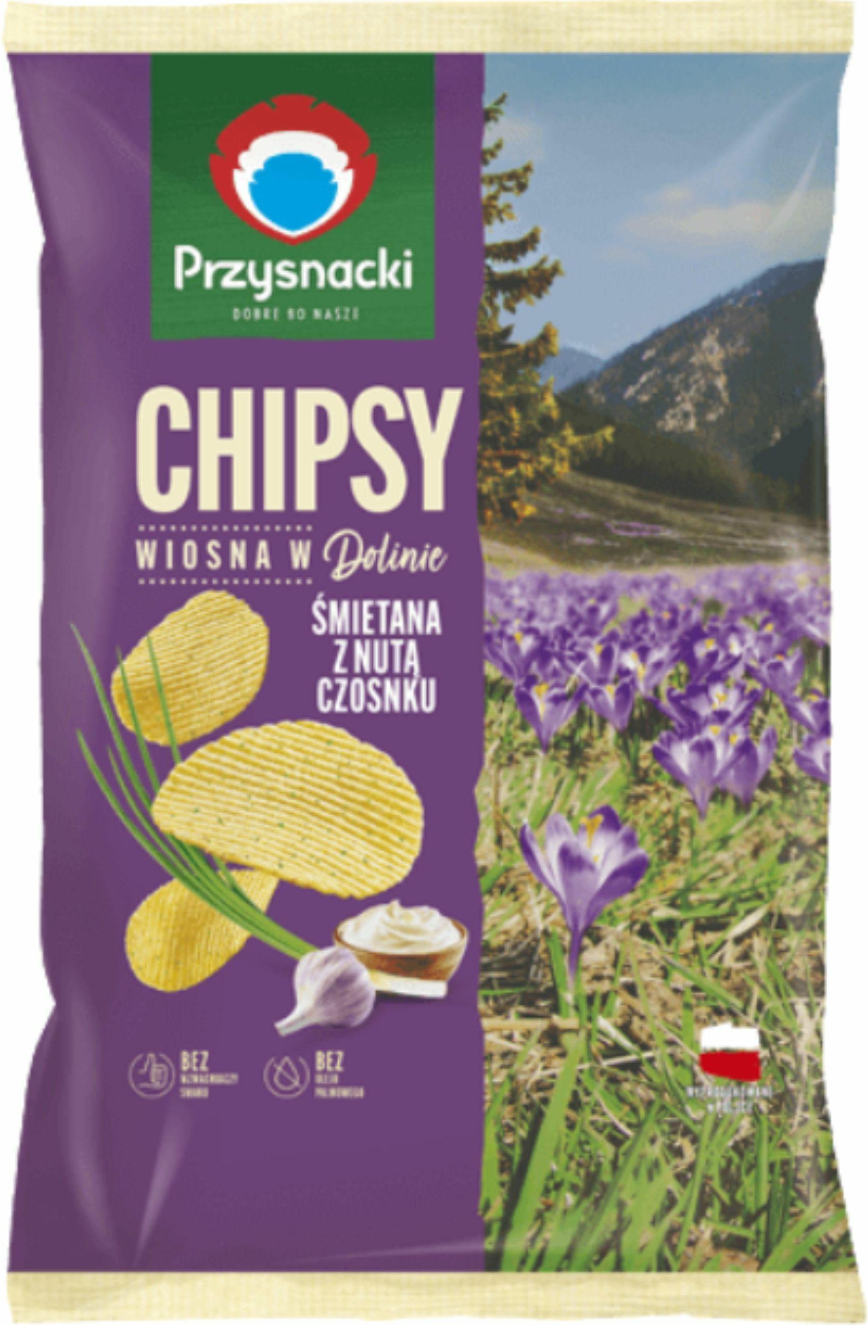 Przysnacki Chipsy Ziemniaczane o Smaku Śmietanowo Czosnkowym 130g 9 sztuk Przysnacki Chipsy Wiosna w Dolinie to chrupiące chipsy ziemniaczane o wyjątkowym smaku śmietany z nutą czosnku, inspirowane świeżością wiosennych łąk. Idealne na spotkania ze znajomymi, relaks przy filmie czy przekąskę na świeżym powietrzu. Bez glutenu, bez oleju palmowego i wyprodukowane w Polsce – naturalna przyjemność w każdej paczce! Szczegóły: Marka: Przysnacki Produkt: Chipsy ziemniaczane o smaku śmietany z nutą czosnku Waga: 130 g (1 opakowanie), 1170 g (9 sztuk) Smak: śmietanowo-czosnkowy Forma: karbowane, chrupiące chipsy Cechy: bez glutenu, bez oleju palmowego, wyprodukowano w Polsce Wiosenny smak czosnku i śmietany – chrupiąca świeżość prosto z natury!