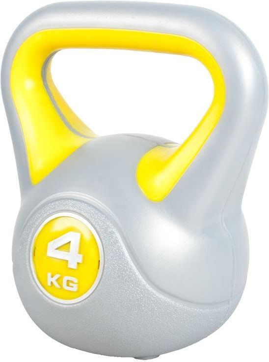 Kettlebell z powłoką winylową 4 kg Specyfikacja Waga: 4 kg Grubość uchwytu: 2,85 cm Powłoka: tworzywo sztuczne Wypełnienie: cement Producent: Gorilla Sports Idealne do treningu siłowego i poprawy równowagi Kettlebell to idealny produkt dla każdego, kto chce pracować nad zwiększeniem siły mięśni. Oprócz tego pomagają również poprawić równowagę i koordynację ruchów. Praca z kettlebell wymusza utrzymanie balansu ciała, co jest zasługą przesuniętego środka ciężkości. Dzięki temu przy treningu pracuje całe ciało! Wygoda używania w domu Nie musisz korzystać z klubu fitness! Kettlebellami bez trudu mogą posłużyć do treningu w domu. Ich powłoka została wykonana z tworzywa sztucznego, które chroni twoją podłogę przed zarysowaniem. Nasze kettle do ćwiczeń zostały wyprofilowane od spodu, aby zminimalizować ryzyko obijania się o podłogę. Dzięki temu rozwiązaniu kettlebell nie turla się po ziemi. Przeznaczenie do treningu crossfit i siłowego Przykładowe ćwiczenia z kettlebell Kettlebell swing – dynamiczne wymachy angażujące nogi, pośladki i plecy Goblet squat – przysiady z kettlebell trzymanym przed klatką piersiową Turkish get-up – kompleksowe ćwiczenie poprawiające mobilność i stabilizację Kettlebell press – wyciskanie nad głowę dla wzmocnienia barków Kettlebell row – wiosłowanie dla mięśni pleców