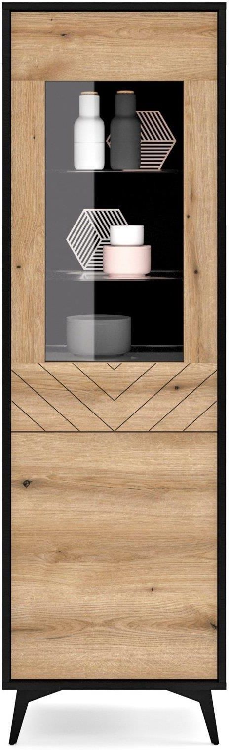 LOFTOWA WITRYNA Brego w jodełkę przeszklona 178cm Loftowa komoda Brego Loftowa witryna na wysokich nóżkach oraz z frontem z dekorem w jodełkę to sprawdzony przepis na centralne miejsce w salonie lub sypialni. Seria mebli Brego to połączenie czarnego korpusu mebla z frontami w kolorze dębu. Dodatkowe frezowanie w kształcie jodełki to element, który odróżnia serię Brego od zwykłych loftowych mebli. Do produkcji mebli wykorzystana została wytrzymała płyta meblowa zabezpieczona okleiną imitującą naturalne drewno. Meble z serii Brego nie posiadają standardowych uchwytów, a otworzyć możemy je dzięki wygodnej funkcji push to open. Za pomocą naciśnięcia na front, mebel lekko się otwiera. Podstawą komody są metalowe nogi o zwężającej się budowie i zarazem o konstrukcji lekko rozszerzającej się na zewnątrz. ✅ Stylowy mebel idealny do salonu lub sypialni z charakterystycznym frontem z dekorem w kształcie jodełki. ✅ Czarny korpus i fronty w kolorze dębu to eleganckie połączenie. ✅ Wytrzymała płyta meblowa z okleiną imitującą drewno. ✅ Funkcja push to open, metalowe nogi. ✅ Wymiary opakowania to 20x20x15cm oraz 170x60x7cm, a waga to 1,5kg i 35kg. Kup teraz! Wysokość (cm): 178 Szerokość (cm): 54 Głębokość (cm): 39 Kolor: brązowy, czarny Kolor:: naturalny dąb Kolor podstawy: czarny Front: w jodełkę Rodzaj podstawy: 4 nogi Materiał blatu: płyta meblowa Materiał: płyta meblowa, metal Wymaga montażu: tak Materiał podstawy: metal AX-sem: to do Pomieszczenie: salon, sypialnia, przedpokój, jadalnia Styl: loftowy, nowoczesny Funkcje/cechy: push to open