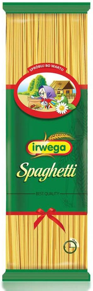 IRWEGA Makaron spaghetti 400 g Makaron "spaghetti" od polskiego producenta - "Irwega". Makaron w opakowaniach po 0,4 kg.