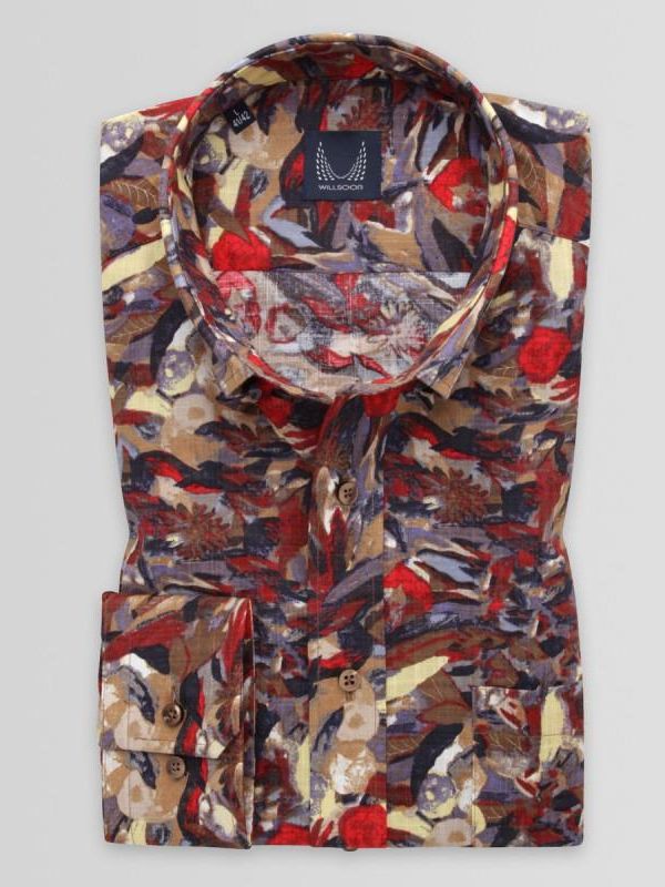 Klasyczna koszula w brązowe, niebieskie i czerwone liście z podpinanym kołnierzykiem, tkanina z dodatkiem wiskozy