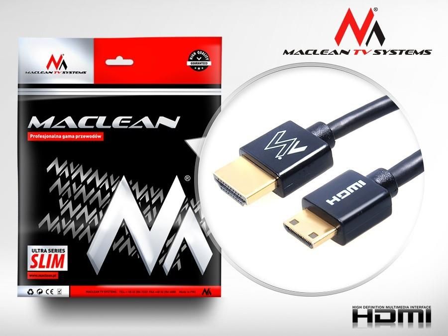 Przewód HDMI-miniHDMI ULTRA SLIM v1.4 2m Maclean MCTV-712 A-C Seria przewodów Maclean Ultra-Slim została zaprojektowana aby połączyć doskonałe parametry, wygodę użytkowania oraz przystępną cenę. Cechy: Wysokiej jakości przewód audio-wideo Wąski przewód dla uzyskania zwiększonej wygody oraz mobilności Pokrywane 24 karatowym złotem konektory Odporne na utlenianie przyłącza w celu zapewnienia najlepszej przewodności i redukcji strat sygnału Obsługuje bardzo szerokie pasmo częstotliwości i wszystkie formaty Podwójnie ekranowany dla zapewnienia odporności na zakłócenia oraz zmniejszenia zniekształceń Ethernet - rezygnacja z dodatkowych przewodów internetowych, wszystko w jednym przewodzie HDMI v1,4 Obsługa rozdzielczości wyższej niż Full HD ("4K" - 4096 x 2160) Pełne wsparcie dla obrazu 3D Czysty dźwięk Współpracuje z takimi urządzeniami jak: Projektory Ekrany plazmowe Telewizory LCD Monitory cyfrowe Panele TFT/LCD Informacje o produkcie Długość przewodu 2 m Rodzaj Kabel Zastosowanie Wideo Komputerowy Złącza #1 HDMI Typ A Męska Złącza #2 HDMI Typ C Męska (mini) Standard HDMI High Speed with Ethernet (1.4; 1080p + LAN) Kolor Czarny