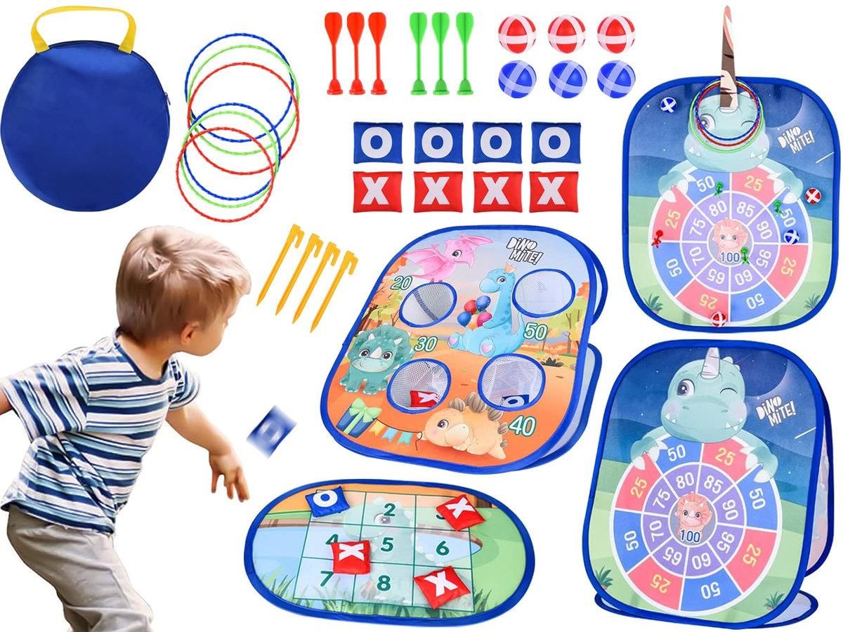 ZESTAW GIER ZRĘCZNOŚCIOWYCH - 5w1 Tossing Game Board to zestaw aż 5 niesamowitych gier połączonych w jedną składaną tablicę. W skład zestawu wchodzą takie gry jak: rzucanie pierścieniem, kołko i krzyżyk, rzutki, rzucanie piłeczkami oraz rzucanie woreczkami. Zestaw ten przyniesie nie tylko wiele radości małym dzieciom, ale także pomoże im rozwinąć koordynację ręka-oko, umiejętności motoryczne i umiejętności liczenia. ZAWARTOŚĆ ZESTAWU: trójstronna składana materiałowa tablica do gry torba do przechowywania piankowy róg do rzucania pierścieni 2 haczyki 4 plastikowe śledzie 6 obręczy 6 kulek na rzep 6 rzutek 8 worków fasoli (kółko i krzyżyk) SPECYFIKACJA: Wymiary tablicy do gier ok.: 48,5 x 31 x 55 cm Wymiary opakowania ok.: 25 x 6,5 x 23,5 cm Sugerowany wiek: 3 lata+ OSTRZEŻENIE Nieodpowiednie dla dzieci w wieku poniżej 3 lat z uwagi na małe elementy i możliwość ich połknięcia. Opakowanie nie jest zabawką. Nie należy udostępniać go dzieciom do zabawy. Zalecane jest odpakowanie zabawki przez osobę dorosłą. Należy zachować etykietę ponieważ zawiera ważne informacje.