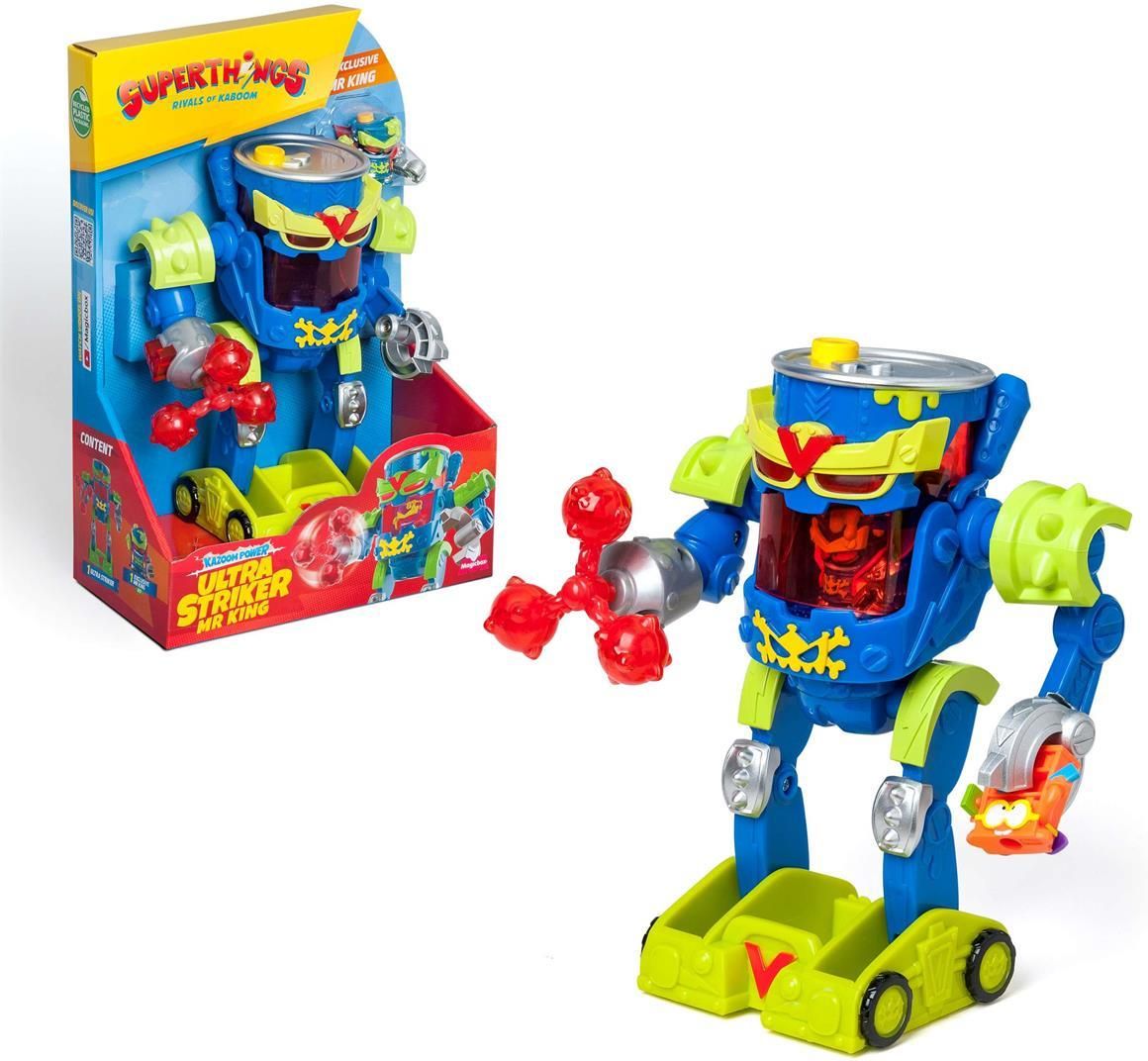 Dołącz do poszukiwań Kazoom wraz z SuperThingsami! W nowych odcinkach serialu animowanego Cartoonito „SuperThings Kazoom Power” Professor K tworzy z fragmentu energii Kazoom robota Ultra Striker dla Mister Kinga, dzięki czemu nikt nie będzie w stanie go powstrzymać! Umieść superzłoczyńcę w kabinie, aby sterował robotem. Robot ma koła, dzięki którym może niszczyć wszystko na swojej drodze! Przejdź do pozycji ataku dzięki jego wysuwanym nogom. Aktywuj atak obrotowy połączonymi kulami w jednej pięści i chwytaj wrogów hakiem zamontowanym w drugiej pięści. Zawartość: 1 robot Ultra Striker Mr. King 1 ekskluzywny Mr. King EAN: 8431618041208