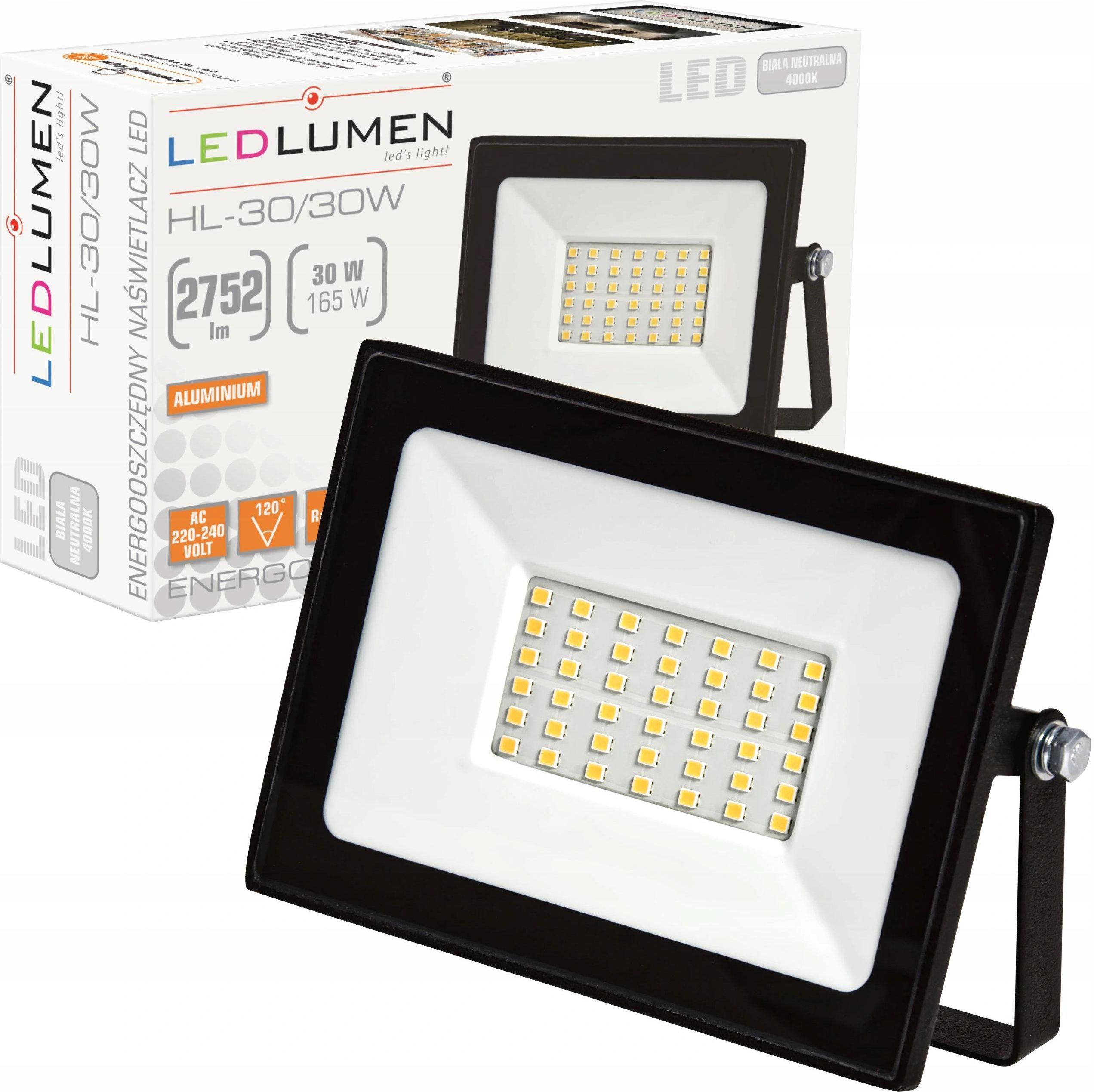 Naświetlacz Halogen Lampa Slim LED 30W=165W 2752lm Kolor: czarny Stopień ochronny: IP65 / hermetyczny Moc strumienia świetlnego: 2752lm Efektywność świetlna: 92lm/W Odpowiednik tradycyjnej żarówki: 165W Kolor świecenia: Neutralna biel 4000K ✅ Jak wybrać barwę światła ➡️ https://youtu.be/NzFCijbe5So ✅ Współczynnik oddawania barw, jak to działa? ➡️ https://youtu.be/5Gp9lBSJSQI Typ: HL Moc strumienia świetlnego: 2752lm Efektywność świetlna: 92lm/W Odpowiednik tradycyjnej żarówki: 165W Współczynnik mocy (Power Factor): PF>0,9 Stopień ochronny: IP65 Kąt rozsyłu: 120° Kolor świecenia: Neutralna biel 4000K Wskaźnik oddawania barw (CRI): Ra>80 Możliwość ściemniania: NIE Przetwornica CCD: NIE Napięcie: 220-240V AC Moc: 30W Trwałość: 30000h Liczba cykli pracy: 50000 Wymiary: 150x95x28mm Etykieta wydajności energetycznej: A+ Zużycie energii przez 1000 godz.: 30kWh Materiał korpusu: aluminium Certyfikaty: CE, RoHS Nazwa artykułu: HL-30/30W naświetlacz LED IP65 NW Marka: LEDLUMEN Indeks katalogowy: 251090413
