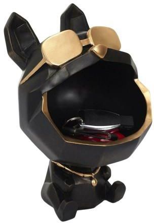 Czarny organizer w kształcie psa w złotych okularach to śmieszna i niebywała ozdoba, która jednocześnie będzie miejscem do przechowywania kluczy lub telefonu. Organizer został zrobiony z tworzywa, przypominającego czarny beton. Złote dodatki dodają organizerowi eleganckiego wyglądu, dzięki czemu będzie on idealnym elementem wnętrza modern glamour. Wymiary opakowania: 31,5x22,5x22,5 cmParametryWysokość: 23,5Szerokość: 17Głębokość: 17