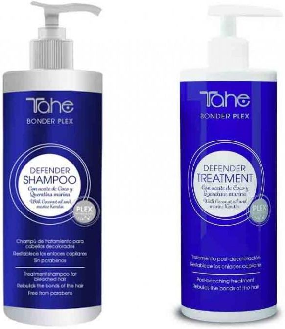 1.DEFENDER SZAMPOO - SZAMPON REGENERUJĄCY DO WŁOSOW DEKOLORYZOWANYCH Przywraca połączenia kapilarne. Ultramiękka formuła do mycia włosów i skóry głowy.Utrzymuje rozjaśniane włosy, mocne, miękkie i lśniące. Składniki aktywne: Olej kokosowy: dostarcza składniki odżywcze i pielęgnacyjne. Pozwala włosom odzyskać ich naturalną witalność, sprężystość i blask. Morska Keratyna: Keratyna uzupełnia niedobór naturalnych składników budujących strukturę włosów, wzmacnia je, przywraca połysk i regeneruje, zabezpiecza także przed szkodliwym działaniem środków chemicznych. Zwiększa grubość, objętość włosów, i ich elastyczność. Zmniejsza tendencję do rozdwajania końcówek. Sposób użycia: Nałożyć odpowiednią ilość na mokre włosy i wmasować, pozostawić na 2 minuty i spłukać dużą ilością wody. 400 ml 2.Kuracja do włosów dekoloryzowanych Tahe ma lekką konsystencję, która nie obciąża włosów. W składzie kuracji można znaleźć olej kokosowy, który jest doskonałym środkiem pielęgnującym włosy. W formule kuracji można także znaleźć morską keratynę, która przypomina naturalną keratynę występującą w łodydze włosów. Przywraca wiązania kapilarne, dzięki czemu stają się one silniejsze i bardziej sprężyste podczas procesu wybawiania koloru. Olej kokosowy znajdujący się w kuracji stanowi naturalny filtr słoneczny, a także wykazuje właściwości antybakteryjne. Ochronna kuracja do włosów dekoloryzowanych Tahe to formuła wysoce odbudowująca i odżywcza. Kuracja przywraca równowagę skórze i właściwy poziom pH, a także wzmacnia strukturę włosów po zabiegach chemicznych. Kuracja łagodzi stany zapalne skóry głowy wywołane zabiegiem dekoloryzacji. Kuracja długotrwale nawilża, odżywia i wzmacnia włosy na całej długości. Kosmetyk uzupełnia ubytki w włóknach włosów, przywraca miękkość pasmom i sprawia, że włosy są doskonale gładkie i lśniące. Dzięki kuracji można zapomnieć o problemie łamliwych włosów i rozdwojonych końcówek. Uzupełnia niedobory keratyny Przywraca odpowiedni poziom pH Odbudowa wiązań kapilarnych Idealne wygładzenie pasm Głębokie odżywienie Długotrwała regeneracja Sposób użycia: Po wykonanej dekoloryzacji i spłukaniu dużą ilością wody, użyj szamponu oczyszczającego Total Cleasing Tahe. Włosy osusz i odciśnij. Na włosy nałóż DefenderTreatment, pozostaw na włosach od 10 do 20 minut. Spłucz obficie wodą, użyj Bonder Plex Champú Defender lub zastosuj zabieg pielęgnacyjny (według uznania profesjonalnego). W razie potrzeby zastosuj Bonder Plex Defender Mask. Ponownie spłucz i kontynuuj zwykłe suszenie Pojemność: 400ml