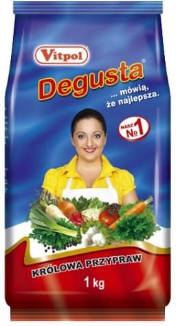 Przyprawa uniwersalna Degusta 200g Vitpol idealnie nadaje się do zup, sosów, potraw mięsnych, drobiowych i rybnych.Ta popularna przyprawa to gwarancja jakości i smaku każdego przygotowanego dania.SKŁADNIKIsól, suszone warzywa 16% (marchew, pasternak, ziemniak, seler korzeń, cebula, natka pietruszki, por, papryka słodka, czosnek, pomidor), cukier, wzmacniacz smaku – glutaminian monosodowy, pieprz czarny, hydrolizat białka sojowego, ziele angielskie, barwnik (ryboflawina).POLECAMY ZAKUP KARTONU ZBIORCZEGO - 6 SZTUK