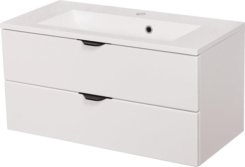 Szafka łazienkowa w białym matowym kolorze i czarnymi uchwytami wraz z prostokątną białą dolomitową umywalką z serii VICTA.