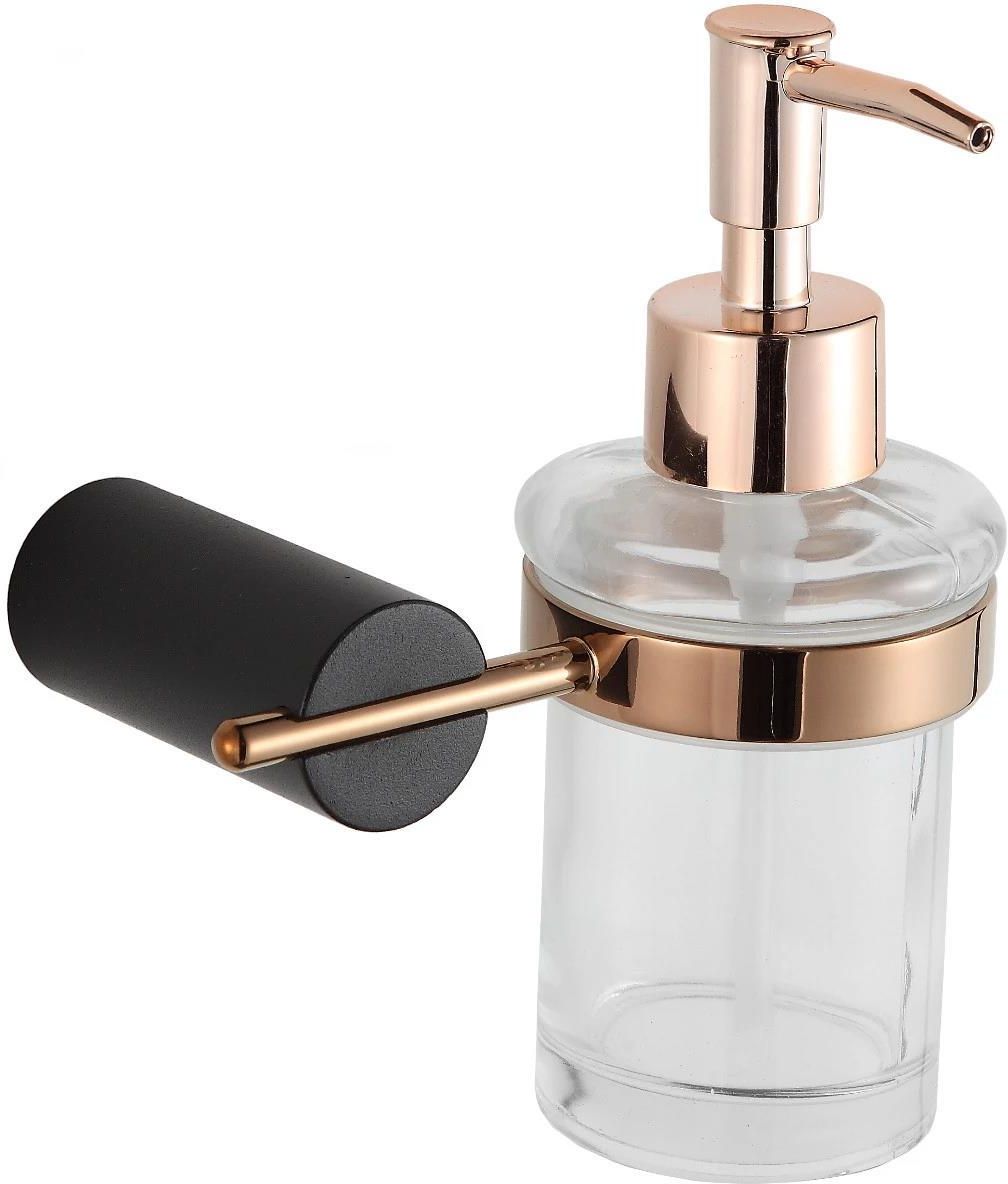 Mexen Aron dozownik do mydła montowany do ściany, czarny/rose gold Producent: Mexen Seria: Aron Numer katalogowy: 70881388-67 Dane techniczne Materiał: Mosiądz + Szkło Wykończenie: Czarny/Rose Gold Pojemność: 180 ml Szerokość: 115 mm Wysokość: 200mm Odległość od ściany: 120 mm