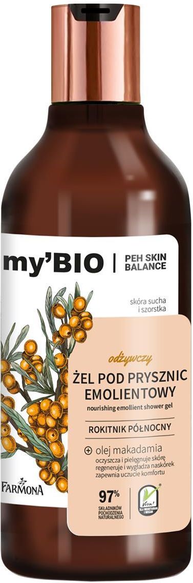 Farmona my'BIO Odżywczy Żel pod prysznic Emolientowy - Rokitnik Północny Oczyszcza skórę: Dzięki łagodnym środkom myjącym skutecznie oczyszcza skórę, nie naruszając jej naturalnej bariery ochronnej. Odżywia skórę: Niezwykle odżywcze emolienty w połączeniu z ekstraktem z rokitnika północnego intensywnie odżywiają skórę. Wygładza skórę: Pozostawia skórę odczuwalnie gładszą i bardziej miękką. Zapewnia uczucie komfortu: Użytkowanie żelu pod prysznic przynosi ulgę i uczucie komfortu dla skóry. Odżywczy żel pod prysznic emolientowy my'BIO to produkt opracowany z myślą o skutecznej pielęgnacji skóry, zgodnie z filozofią PEH SKIN BALANCE. Jego unikalna formuła, łącząca łagodne środki myjące z niezwykle odżywczymi emolientami oraz wyjątkowo cennym ekstraktem z rokitnika północnego, nie tylko delikatnie oczyszcza skórę, ale również intensywnie ją odżywia i wygładza. Dzięki temu żel zapewnia nie tylko czystość, ale również odczuwalne uczucie komfortu i wygładzenia skóry już od pierwszego użycia. Regularne stosowanie żelu pod prysznic my'BIO pozwala zachować skórę w doskonałej kondycji, sprawiając, że staje się ona bardziej miękka, elastyczna i promienna. Pojemność:500ml