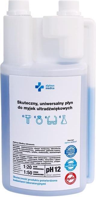 Alpinus Medica Ultrasonic – Uniwersalny koncentrat do myjek ultradźwiękowych, 1L Alpinus Medica Ultrasonic to wszechstronny koncentrat w płynie stworzony z myślą o myjkach ultradźwiękowych. Dzięki swojej uniwersalności i skuteczności znajduje zastosowanie w różnych branżach, takich jak medycyna, laboratoria, kosmetyka, elektronika czy jubilerstwo. Jego formuła zapewnia niezawodne działanie w usuwaniu zanieczyszczeń oraz ochronę delikatnych materiałów. Zastosowanie Alpinus Medica Ultrasonic Płyn Alpinus Medica Ultrasonic to idealny wybór dla: Obszaru medycznego: Dezynfekcja narzędzi chirurgicznych, dentystycznych oraz ortodontycznych. Laboratoriów: Czyszczenie sprzętu laboratoryjnego i naczyń szklanych. Warsztatów samochodowych: Usuwanie olejów, smarów i osadów z części mechanicznych. Jubilerstwa i numizmatyki: Oczyszczanie biżuterii, monet i przedmiotów o wysokiej wartości. Kosmetyki i optyki: Czyszczenie narzędzi kosmetycznych, okularów oraz delikatnych akcesoriów. Elektroniki: Usuwanie zanieczyszczeń z układów elektronicznych i drobnych komponentów. Skuteczność w usuwaniu zanieczyszczeń Alpinus Medica Ultrasonic doskonale radzi sobie z: Olejami i smarami, zarówno roślinnymi, jak i maszynowymi. Osadami mineralnymi i gipsowymi. Zanieczyszczeniami organicznymi oraz tłuszczami. Przypalonymi tłuszczami oraz białkami. Tlenkowymi osadami na metalach. Kluczowe właściwości produktu Uniwersalność: Szerokie zastosowanie w różnych branżach sprawia, że płyn jest niezwykle praktyczny i wszechstronny. Efektywność: Koncentrat o wydajnym stężeniu (1:50 do lekkich zabrudzeń, 1:20 do silnych zanieczyszczeń) pozwala na oszczędne użytkowanie. Bezpieczeństwo: Nie zawiera agresywnych wodorotlenków i nie uszkadza metali, tworzyw sztucznych ani innych materiałów w zalecanych stężeniach. Ochrona: Zawiera inhibitor korozji, który chroni narzędzia i urządzenia przed uszkodzeniami. Biodegradowalność: Przyjazny dla środowiska dzięki zastosowaniu biodegradowalnych składników. Łatwość dozowania: Wygodna butelka ułatwia precyzyjne odmierzenie odpowiedniej ilości płynu. Skład produktu 2-butoksyetanol: Składnik o silnych właściwościach czyszczących. EDTA sól sodowa: Chelatujący środek usuwający osady mineralne. Niejonowe środki powierzchniowo czynne: Skutecznie eliminują tłuszcze i inne zanieczyszczenia. Dlaczego warto wybrać Alpinus Medica Ultrasonic? Skuteczność: Doskonałe właściwości czyszczące i odtłuszczające. Wszechstronność: Nadaje się do szerokiego zakresu zastosowań w różnych branżach. Bezpieczeństwo: Chroni czyszczone przedmioty oraz skórę użytkownika. Ekonomia: Wydajny koncentrat pozwala na długotrwałe użytkowanie nawet przy intensywnej eksploatacji. Specyfikacja produktu Nazwa: Alpinus Medica Ultrasonic Pojemność: 1 litrów Typ produktu: Koncentrat do myjek ultradźwiękowych Kod producenta: 5908269290925