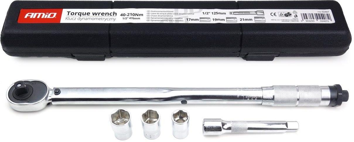 AMiO AMI02407 Klucz dynamometryczny AMiO AMI02407 to narzędzie, które powinno znaleźć się w warsztacie każdego profesjonalisty. Dzięki swojemu zaawansowanemu designowi i wysokiej jakości wykonania, jest idealnym rozwiązaniem dla osób, które potrzebują precyzyjnego narzędzia do dokręcania śrub i nakrętek. AMiO, renomowany producent narzędzi, gwarantuje niezawodność i długowieczność swojego produktu. Wysoka jakość wykonania Jednym z najważniejszych aspektów klucza dynamometrycznego AMiO AMI02407 jest materiał, z którego został wykonany. Wykorzystano tu stal chromowo-wanadową CRV, co zapewnia wyjątkową trwałość oraz odporność na zużycie. To solidne narzędzie przetrwa wiele lat eksploatacji, nawet w wymagających warunkach warsztatowych. Precyzyjna regulacja siły dokręcania Dzięki możliwości regulacji siły dokręcania w zakresie od 40 do 210 Nm, klucz ten pozwala na dokładne dostosowanie momentu obrotowego do specyficznych wymagań danego zadania. Dodatkowo, blokada zabezpieczająca przed przypadkową zmianą momentu dokręcania zapewnia bezpieczeństwo i pewność podczas pracy. Zestaw akcesoriów Zestaw zawiera nie tylko sam klucz dynamometryczny, ale również kilka przydatnych akcesoriów: klucz dynamometryczny 1/2" z blokadą, przedłużenie 1/2" o długości 125 mm, 3 nasadki (17 mm, 19 mm, 21 mm), futerał. Profesjonalne zastosowanie AMiO AMI02407 to narzędzie o profesjonalnym charakterze, które spełni oczekiwania najbardziej wymagających użytkowników. Posiada certyfikat zgodności CE, co świadczy o jego wysokiej jakości i zgodności z europejskimi standardami bezpieczeństwa. Ramię klucza o długości 47 cm umożliwia komfortowe i efektywne użytkowanie.