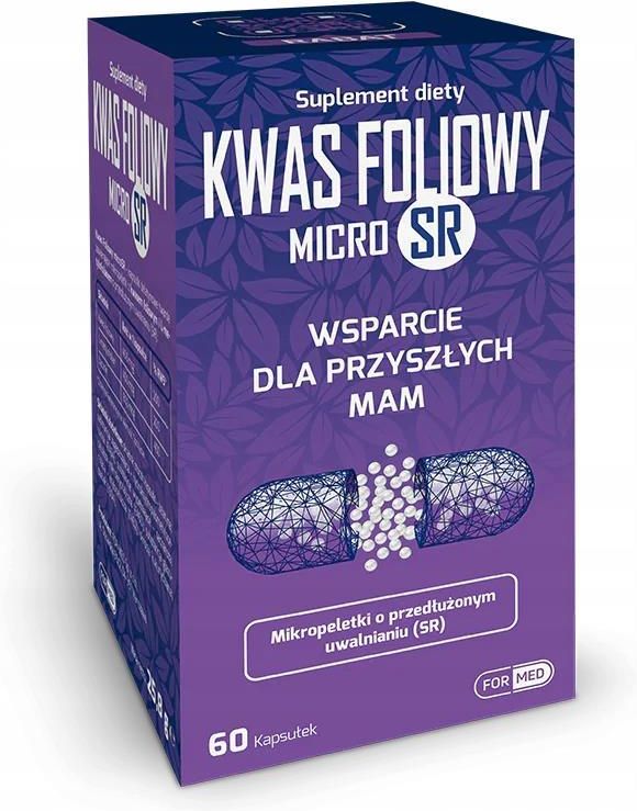 Opis produktu Kwas Foliowy MicroSR to zaawansowany suplement diety znany również jako witamina B9, odgrywający niezwykle istotną rolę w prawidłowym rozwoju płodu oraz zapobieganiu wadom cewy nerwowej u noworodków. Dla kogo Kobiet w ciąży i planujących ciążę: Kwas foliowy jest niezbędny dla prawidłowego rozwoju płodu, szczególnie w pierwszych tygodniach ciąży, kiedy to organizm rozwijającego się dziecka potrzebuje go do formowania układu nerwowego. Suplementacja kwasem foliowym może zmniejszyć ryzyko wad cewy nerwowej u noworodków. Kobiet planujących ciążę: Kobiety planujące ciążę powinny zadbać o odpowiednie spożycie kwasu foliowego już przed zajściem w ciążę, aby zabezpieczyć się przed wadami cewy nerwowej u potencjalnego dziecka. Osób z niedoborem kwasu foliowego: Niedobór kwasu foliowego może prowadzić do anemii, zmęczenia oraz problemów z układem nerwowym. Suplementacja kwasem foliowym może pomóc w uzupełnieniu niedoborów tego składnika. Skład Jedna kapsułka zawiera 400 mcg kwasu foliowego i 400 mcg L-metylofolianu. Nie zawiera: produkt bezglutenowy nie zawiera laktozy Sposób użycia Jedna kapsułka dziennie Kwasu Foliowego microSR. Kapsułkę należy popić odpowiednią ilością wody. Przedłużone uwalnianie Technologia mikropeletek pozwala na rozproszenie dawki na wiele mikro dawek. Peletki mogą być powlekane różnego rodzaju polimerami, które pozwalają na regulowanie uwalniania substancji aktywnych. Dzięki temu można osiągnąć szereg korzyści dla pacjenta: redukcję ryzyka podrażnienia układu pokarmowego przez substancję aktywną zwiększenie wchłaniania ukrycie zapachu i smaku lokalne zmniejszenie dawek substancji aktywnych Najwyższy certyfikat przy produkcji żywności GMP zapewnienie wysokich standardów w poszczególnych procesach produkcji możliwie najlepsze przestrzeganie higieny wykluczenie z procesu produkcyjnego wszelkich działań przypadkowych zasady GMP zapewniają wysoką jakość i czystość materiałów użytych do produkcji danego wyrobu oraz pełną kontrolę nad pochodzeniem, jakością surowców i całym procesem produkcyjnym stosowanie zasad GMP podnosi poziom bezpieczeństwa produktów konsumenckich w sektorze produkcji żywności GMP ma na celu kształtowanie jakości odżywczej, bezpieczeństwa zdrowotnego oraz cech organoleptycznych żywności (suplementów)