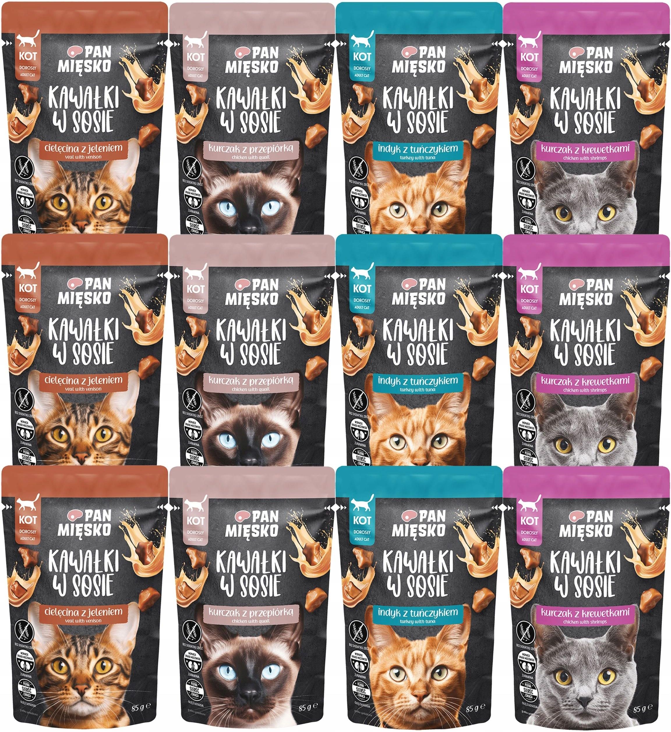 Pan Mięsko Karma mokra Dla kota Kawałki w sosie MIX SMAKÓW 12 x 85 gram Przeznaczenie: Pełnoporcjowa mokra karma dla dorosłych kotów Cechy bez zbóż duża zawartość mięsa kawałki w sosie ZAWARTOŚC ZESTAWU Pan Mięsko kawałki w sosie o smaku Cielęcina z Jeleniem 3 x 85g SKŁAD: Cielęcina 71 % w rozdrobnionych kawałkach (mięso 31 %, serca, wątroba, płuca) Jeleń 8 % w rozdrobnionych kawałkach Białko wołowe 3% skrobia z tapioki Składniki mineralne suszona żurawina0,2 % Olej z łososia 0,2% Suszone drożdże piwne 0,2% Bazylia 0,1% Kawałki stanowią 52% gotowego produktu SKŁADNIKI ANALITYCZNE Białko surowe 10,5% Włókno surowe 0,4% Tłuszcz surowy 4% Popiół surowy 2,2% Wilgotność 81% Wapń 0,2% Fosfor 0,18% DODATKI DIETETYCZNE Tauryna 1500 mg Witamina E (octan all-rac-alfa-tokoferylu) 100 mg Cynk (tlenek cynku) 10 mg Mangan (siarczan manganawy, monohydrat) 2 mg Jod (bezwodny jodan wapnia) 0,7 mg Miedź (pentahydrat siarczanu miedzi (II)) 2 mg Żelazo (siarczan żelaza (II), monohydrat) 2 mg Witamina D3 (cholekalcyferol) 300 IU Biotyna 100 μg Pan Mięsko kawałki w sosie o smaku Kurczaka z Krewetkami 3 x 85g SKŁAD Kurczak 71 % w rozdrobnionych kawałkach (mięso 52 %, wątroba, żołądki) Krewetki 8 % w rozdrobnionych kawałkach białko wołowe 3 % Skrobia z tapioki Składniki mineralne Suszona żurawina 0,2% Olej z łososia 0,2% Suszone drożdże piwne 0,2% Bazylia 0,1% Kawałki stanowią 52% gotowego produktu SKŁADNIKI ANALITYCZNE Białko surowe 10,5% Włókno surowe 0,4% Tłuszcz surowy 4% Popiół surowy 2,2% Wilgotność 81% Wapń 0,2% Fosfor 0,18% DODATKI DIETETYCZNE Tauryna 1500 mg Witamina E (octan all-rac-alfa-tokoferylu) 100 mg Cynk (tlenek cynku) 10 mg Mangan (siarczan manganawy, monohydrat) 2 mg Jod (bezwodny jodan wapnia) 0,7 mg Miedź (pentahydrat siarczanu miedzi (II)) 2 mg Żelazo (siarczan żelaza (II), monohydrat) 2 mg Witamina D3 (cholekalcyferol) 300 IU Biotyna 100 μg. IU = jednostka międzynarodowa Pan Mięsko kawałki w sosie o smaku Indyka z Tuńczykiem 3 x 85g SKŁAD Indyk 71 % w rozdrobnionych kawałkach (mięso 27 %, serca, żołądki, wątroba) Tuńczyk 8 % w rozdrobnionych kawałkach Białko wołowe 3 %, skrobia z tapioki składniki mineralne Suszona żurawina 0,2 % Olej z łososia 0,2 % Suszone drożdże piwne 0,2 % Bazylia 0,1 % Kawałki stanowią 52 % gotowego produktu. SKŁADNIKI ANALITYCZNE Białko surowe 10,5 % Włókno surowe 0,4 % Tłuszcz surowy 4 % Popiół surowy 2,2 % Wilgotność 81 % Wapń 0,2 % Fosfor 0,18 % DODATKI DIETETYCZNE Tauryna 1500 mg Witamina E (octan all-rac-alfa-tokoferylu) 100 mg Cynk (tlenek cynku) 10 mg Mangan (siarczan manganawy, monohydrat) 2 mg Jod (bezwodny jodan wapnia) 0,7 mg Miedź (pentahydrat siarczanu miedzi (II)) 2 mg Żelazo (siarczan żelaza (II), monohydrat) 2 mg Witamina D3 (cholekalcyferol) 300 IU Biotyna 100 μg. IU = jednostka międzynarodowa ENERGIA METABOLICZNA 83,9 kcal/100g Pan Mięsko kawałki w sosie o smaku Kurczaka z Przepiórką 3 x 85g SKŁAD Kurczak 71% w rozdrobnionych kawałkach (mięso 52 %, wątroba, żołądki) Przepiórka 8% w rozdrobnionych kawałkachbiałko wołowe 3% Skrobia z tapioki Składniki mineralne Suszona żurawina 0,2% Olej z łososia 0,2% Suszone drożdże piwne 0,2% Bazylia 0,1% Kawałki stanowią 52% gotowego produktu SKŁADNIKI ANALITYCZNE Białko surowe 10,5 % Włókno surowe 0,4 % Tłuszcz surowy 4 % Popiół surowy 2,2 % Wilgotność 81 % Wapń 0,2 % Fosfor 0,18 % DODATKI DIETETYCZNE Tauryna 1500 mg Witamina E (octan all-rac-alfa-tokoferylu) 100 mg Cynk (tlenek cynku) 10 mg Mangan (siarczan manganawy, monohydrat) 2 mg Jod (bezwodny jodan wapnia) 0,7 mg Miedź (pentahydrat siarczanu miedzi (II)) 2 mg Żelazo (siarczan żelaza (II) monohydrat) 2 mg Witamina D3 (cholekalcyferol) 300 IU Biotyna 100 μg. IU = jednostka międzynarodowa.