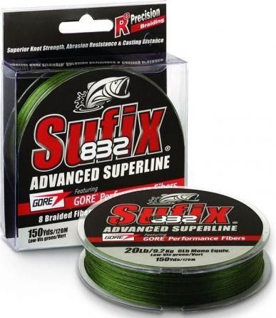 Plecionki 832 Advanced Superline Technologia ciasnego splatania niezwykle wytrzymałych włókien Dyneema® w odpowiedniej proporcji z „niezniszczalnymi” włóknami GORE® Performace Fiber pozwala wyprodukować "superplecionkę", która w porównaniu z wszystkimi innymi dotychczas produkowanymi wędkarskimi plecionkami jest cichsza na przelotkach, bardziej odporna na ścieranie, chemikalia i na promieniowanie UV, a w rezultacie ma większą wytrzymałość i trwałość. Plecionki Sufix 832 Advanced Superline splecione są z siedmiu włókien Dyneema® oraz jednego włókna GORE® Performace Fiber. Włókno GORE® Performace Fiber czyni plecionkę znacznie gładszą, bardziej śliską i odporną na ścieranie. Co ważne, ta gładkość i śliskość utrzymuje się podczas długiego okresu użytkowania plecionki Sufix 832 – plecionka nie strzępi się i zachowuje wytrzymałość, Sufix 832 jest w porównaniu z innymi plecionkami mniej nasiąkliwa i bardziej odporna na sól rozpuszczoną w morskiej wodzie oraz na wszelkie zanieczyszczenia chemiczne spotykane w naszych łowiskach, a także na oddziaływanie promieni UV. Włókna Gore Performance Fiber zmniejszają opory i wibracje na przelotkach zwiększając w ten sposób zasięg oraz precyzję rzutu. Włókna Dyneema® zapewniają dużą wytrzymałość i czułość, małą średnicę oraz hydrofobową ochronę przed nasiąkaniem.