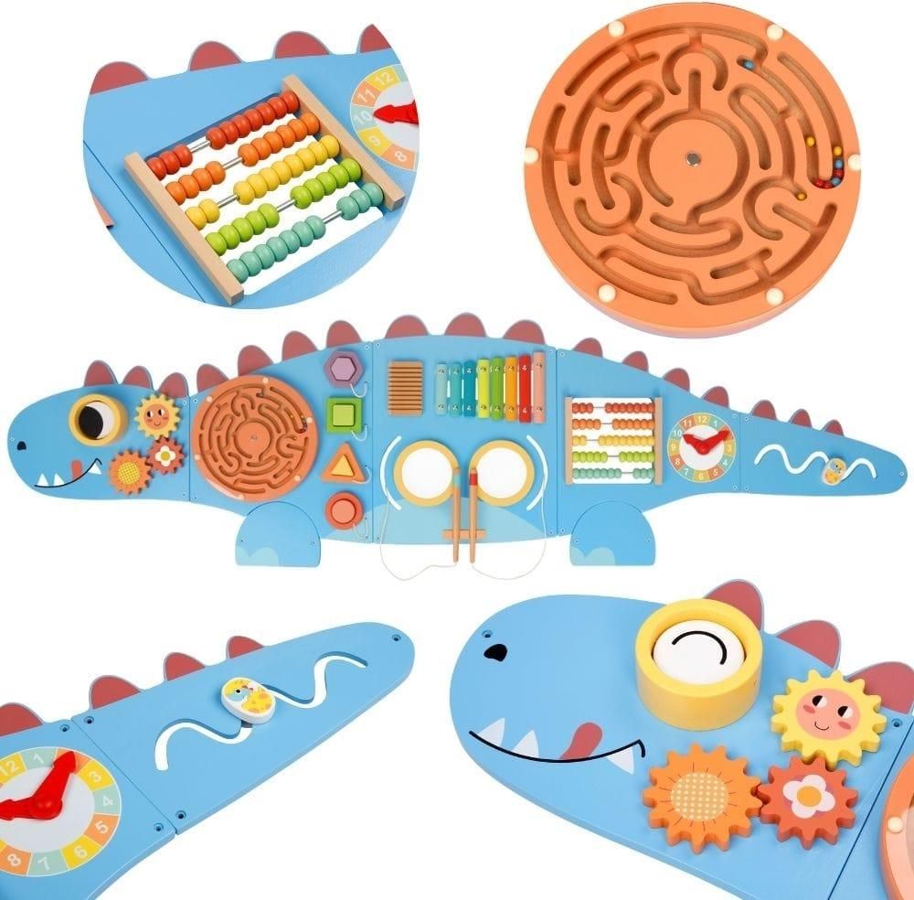 Odkryj magiczny świat dinozaurów połączony z edukacyjną przygodą! Ta wyjątkowa drewniana tablica aktywności w kształcie uroczego dinozaura to prawdziwe centrum rozrywki dla małych odkrywców. Sześć różnorodnych paneli oferuje bogactwo zajęć, które na długie godziny pochłoną uwagę dziecka, rozwijając …