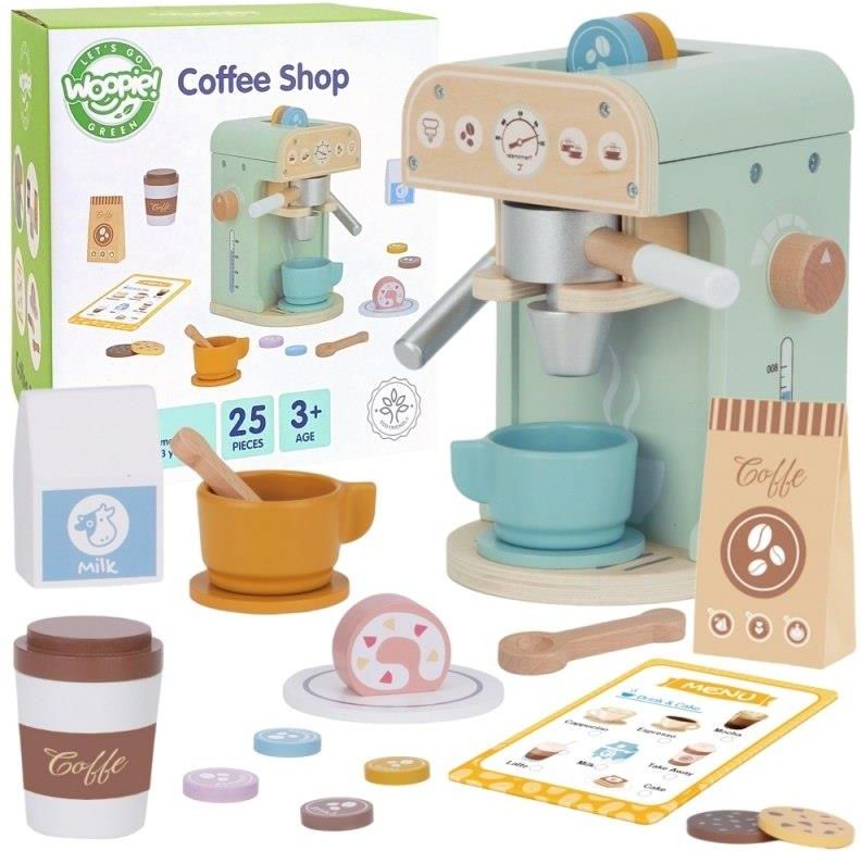 WOOPIE GREEN Drewniany Eksperes do Kawy 25EL Cukiernia Barista Drewniana Kawiarnia od marki Woopie Green to idealna zabawka dla małych miłośników kawy i zabawy w kuchnię. Zestaw pozwala dzieciom wcielić się w rolę baristy, serwując pyszne napoje kawowe i smakołyki. Dzięki 25 elementom, w tym …
