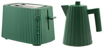 Czajnik elektryczny Alessi Plisse Green, 1 l- Wykonany z żywicy termoplastycznej. Aby otworzyć czajnik, należy użyć pokrętła na pokrywie. Pod uchwytem czajnika znajduje się przełącznik dźwigniowy do włączania i wyłączania czajnika. - Podstawa zasilacza jest ukryta: w dolnej części czajnika znajduje się mały otwór służący do wyciągnięcia kabla.- Lampka na przełączniku dźwigniowym wskazuje, kiedy czajnik jest aktywny. Po osiągnięciu temperatury wrzenia czajnik wyłącza się automatycznie, a przełącznik wraca do pierwotnej pozycji. Aby wyłączyć czajnik zanim woda zacznie wrzeć, wystarczy podnieść go z podstawy zasilającej.- Filtr ukryty w wylewce zapobiega przedostawaniu się cząsteczek kamienia do Twojego napoju. Filtr można wyjąć, opłukać pod bieżącą wodą i umieścić z powrotem w wylewce.- Symbol MAX na wewnętrznej stronie czajnika wskazuje maksymalny poziom wody, jaki jest w stanie utrzymać czajnik.- Zabezpieczenie odcina dopływ prądu w przypadku zbyt małej ilości wody lub jej braku w czajniku, co pozwala uniknąć ewentualnych uszkodzeń.- Uchwyt pozwala na pewny, wygodny chwyt, a kształt wylewki ułatwia nalewanie.- Podstawa czajnika jest izolowana termicznie, co oznacza, że po osiągnięciu przez wodę temperatury wrzenia, czajnik można bezpiecznie postawić na dowolnej powierzchni.- Do czyszczenia wnętrza czajnika zalecamy użycie mieszaniny wody i octu. Do czyszczenia zewnętrznej strony i podstawy zasilacza należy użyć wilgotnej szmatki i łagodnego detergentu.Toster Alessi Plisse Green- Zewnętrzna powłoka wykonana jest z żywicy termoplastycznej, natomiast wewnętrzne części ze stali nierdzewnej.- Jeden z sześciu poziomów przyrumienienia można łatwo wybrać za pomocą dedykowanego przycisku.- Funkcja ponownego podgrzewania pozwala na powrót pieczywa do wymaganej temperatury w ciągu zaledwie 30 sekund.- Funkcja rozmrażania pozwala na rozmrożenie pieczywa przed rozpoczęciem opiekania.- Funkcja bajgla umożliwia opiekanie tylko jednej strony chleba.- Funkcja Stop automatycznie wysuwa pieczywo.- Po użyciu wbudowany kabel można zwinąć i schować w podstawie tostera.- Podstawa jest antypoślizgowa, co zapewnia bezpieczne użytkowanie.- Tacka na okruchy jest łatwa do wyciągnięcia i wsunięcia z powrotem.- Moc: 850 W.*****O "Alessi" "Prawdziwie mistrzowski design musi poruszać ludzi, przekazywać emocje, przywoływać wspomnienia, zaskakiwać i iść wbrew powszechnemu sposobowi myślenia". - Alberto AlessiOd momentu powstania w 1921 roku, firma Alessi stopniowo ewoluowała. Obecnie jest wiodącą postacią w dziedzinie włoskiego wzornictwa, znaną i cenioną za umiejętne pośredniczenie między intrygującymi przejawami kreatywności a potrzebami społeczeństwa. Alessi stara się przekładać śmiałe impulsy twórcze na przedmioty rzeczywiste, zdolne do spełniania marzeń i zaspokajania pragnień.