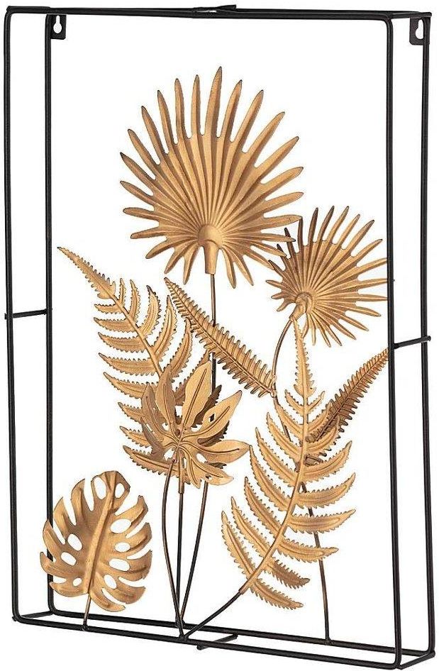 Dekoracja ścienna Ariana II, 34 x 5 x 46 cm Kod produktu: 814-152 Dekoracja do powieszenia na ścianię- metalowe liście w złotym kolorze, umieszczone w delikatnej ramie. Rama wykonana z metalu w kolorze czarnym. Ozdoba idealnie sprawdzi się nad stołem, sofą czy kominkiem nadając pomieszczeniu niepowtarzalny klimat. Lekki i łatwy w powieszeniu dekor będzie charakterystycznym akcentem w pomieszczeniu. Dane produktu Waga: 0.65kg Rozmiar: 34 x 5 x 46 cm Materiał: metal