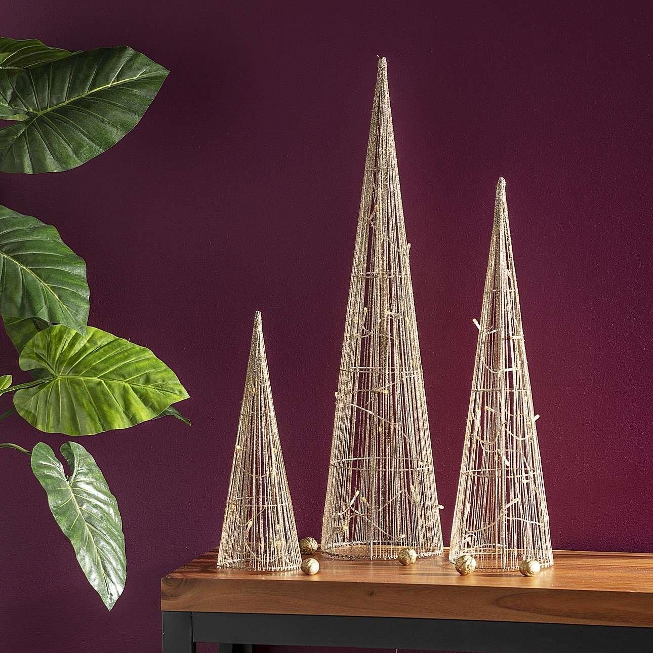 Niezwykle oryginalna dekoracja świetlna o kształcie stożkowej choinki, w złotym kolorze.Całość pokryta brokatem.Na choince znajdują się lampki, które po włączeniu subtelnie rozświetlą wnętrze i wniesie blask do pomieszczenia. Dekoracja Christmas Tree Led to pojedyncza choinka o wys. 40cm, doskonale prezentuje się w towarzystwie innych choinek. Doskonale sprawdzi się ustawiona na komodzie, regale czy parapecie.Zasilana na dwie baterie AA(brak w zestawie).