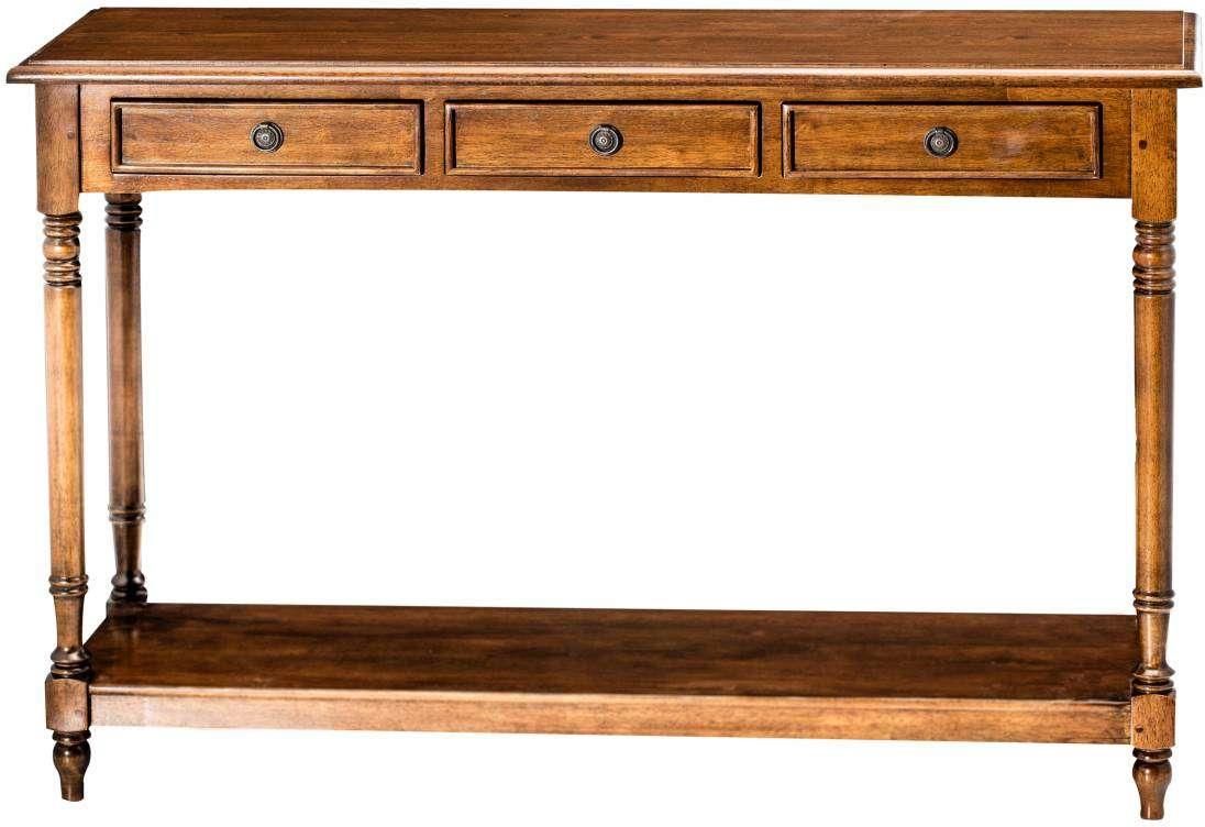 Wysoka konsola Charlie, wykonana z drewna egzotycznego. Delikatnie zdobiona żłobieniami na toczonych nogach. Posiada 3 szuflady oraz półkę. To praktyczny mebel pozwalający wygodnie urządzić pomieszczenie. Idealnie zaprezentuje się w salonie, przedpokoju czy gabinecie. Kolekcja mebli Charlie subtelnie łączy elementy drewniane z elementami metalowymi. Kształt mebli i ich stylowe wykończenie nada wnętrzom uroku. To seria mebli wykonanych z dbałością o szczegóły. Z poszczególnych elementów serii stworzysz spójny wystój wnętrza. Wymiary: szer. 120cm, gł. 40cm, wys. 80cm. Materiał: drewno kauczukowe. Okucie: metalowe. Kolor: brązowy.