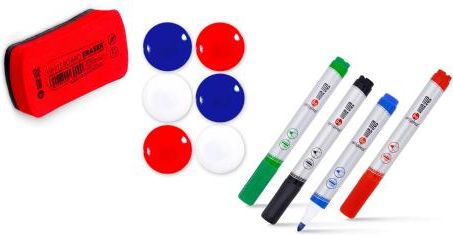 Akcesoria do tablic MEMOBE - ZESTAW NA START 1. Markery kpl. 4 szt. Markery suchościeralne MemoBe. Markery dedykowane do tablic o powierzchniach suchościeralnych - lakierowanych, ceramicznych, szklanych. Tusz o delikatnym zapachu na bazie alkoholu w kolorach czarnym, czerwonym, niebieskim lub zielonym. Okrągła końcówka o grubości linii 2-3 mm. Intensywne kolory. Zestaw zwiera 4 kolory. 2. Gąbka magnetyczna Gąbka MemoBe do czyszczenia tablic suchościeralno - magnetycznych z wbudowanym wewnątrz magnesem, dzięki któremu gąbka jest zawsze pod ręką. Poręczny piankowy uchwyt o ergonomicznym kształcie gwarantuje komfort użytkowania, a miękka filcowa warstwa czyszcząca zapewnia dokładne czyszczenie. 3 . Magnesy 6 szt., f30 mm Magnesy do tablic MemoBe. Zestaw okrągłych magnesów do tablic i innych powierzchni magnetycznych. Plastikowa obudowa nadaje magnesom estetyki. Doskonałe wsparcie podczas prezentacji informacji i grafik. W zestawie 6 szt. o śr. 30 mm, opakowanie blistrowe.