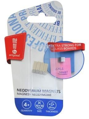 Magnesy do tablic szklanych MEMOBE, 4szt. neodymowe, 1x1x0,4 cm, blister Oferujemy Państwu zupełnie nowy zestaw 4 supermocnych magnesów do szklanych tablic magnetycznych OPIS - neodymowe magnesy w kolorze srebrnym o bardzo silnych właściwościach magnetycznych - dedykowane do tablic magnetycznych, w szczególności do tablic szklanych - kwadratowy kształt 1 x 1 cm - 4 sztuki w opakowaniu