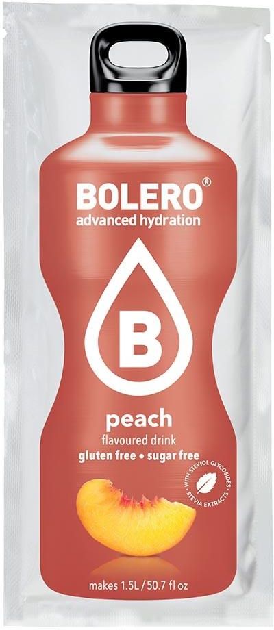 Napój Bolero Drink peach 9g Smak: brzoskwinia Uzupełnij swoje spożycie H2O serią Bolero - smakowitych owocowych smaków od ekspertów w dziedzinie nawodnienia. Znakomicie niskokaloryczny sposób na zwiększenie spożycia wody. Napoje Bolero będą pasować do Twoich niskokalorycznych potrzeb, jeśli jesteś na diecie lub chcesz schudnąć. Bolero można mieszać z wodą (niegazowaną lub gazowaną) aby uzyskać orzeźwiający napój owocowy pełen witaminy C, ale całkowicie pozbawiony tłuszczu, glutenu i cukru. Są idealne dla całej rodziny. Napój wykonany jest z naturalnych ekstraktów owocowych. Jest bezglutenowy, wegański i przyjazny dla diabetyków. Można dodawać do gorącej lub zimnej wody, wody gazowanej, a nawet mleka! Mogą być używane do dodawania smaku jogurtowi, do robienia koktajli, do wytwarzania bezcukrowych lodowów, galaretek, a także do tworzenia i dodawania smaku bezkalorycznemu sernikowi. Wielkość opakowania: 9 g Składniki - w 100 ml Wartość energetyczna - 7 kJ/ 2 kcal Tłuszcz - 0 g Kwasy tłuszczowe nasycone - 0 g Węglowodany - 0 g W tym cukry - 0 g Białko - 0 g Sól - 0 g Witamina C - 8 mg Sposób użycia: Jedna saszetka Bolero Classic jest odpowiednia na 1,5 litra do 2,5 litra lub więcej, w zależności od preferencji. Dla uzyskania delikatniejszego smaku rozpuścić w większej ilości wody . Wystarczy wsypać, zamieszać i gotowe. Podczas korzystania z wody gazowanej zaleca się również rozpuszczenie napoju Bolero z niewielką ilością wody przed zmieszaniem jej z wodą gazowaną, ponieważ może wystąpić reakcja spieniania.