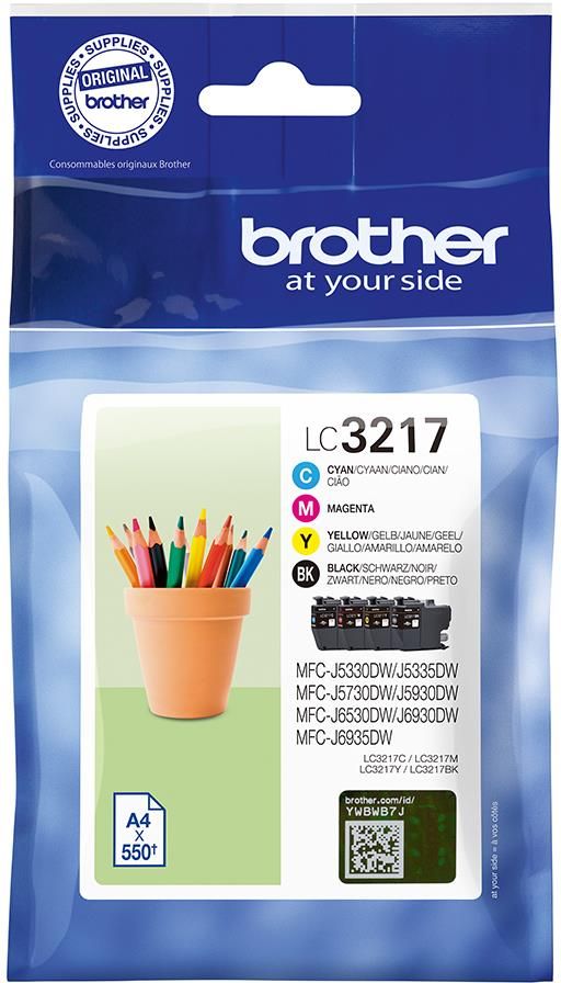 Brother LC3217VALDR Umożliwia wydruk do 2200 stron zgodnie z ISO/IEC24711 Wysokiej jakości oryginalny tusz firmy Brother Zapewnia oszczędność czasu, pieniędzy i papieru Opis produktu  Brother LC3217VALDR Oryginalny zestaw tuszy LC3217VALDR  firmy Brother w kolorach: niebieskim, magenta, czarnym i żółtym  został zaprojektowany, aby zapewnić wysokiej jakości wydruki przy każdym drukowaniu. Zakup naszych tuszy, chroni Twoją drukarkę przed potencjalnymi długoterminowymi uszkodzeniami. Kompatybilne z Brother MFC-J5330DW, MFC-J5335DW, MFC-J5730DW, MFC-J5930DW, MFC-J6530DW, MFC-J6930DW, MFC-J6935DW. Więcej informacji o produkcie Brother LC3217VALDR Zestaw tuszy  LC3217VALDR  firmy Brother w kolorach: niebieskim, magenta, czarnym i żółtym, został zaprojektowany, aby zapewnić wysokiej  jakości wydruki za każdym razem. Kupowanie tańszych zamienników wydaje się kuszące, należy jednak pamiętać, że wpływają one nie tylko na jakość wydruków, ale również na ważność gwarancji oraz możliwe długotrwałe uszkodzenie drukarki. Oryginalny zestaw tuszy  LC3217VALDR  firmy Brother, sprawi, że twoja drukarka będzie działała prawidłowo, wykorzystując pełnię swoich możliwości.