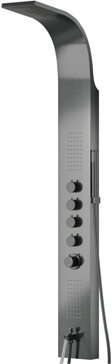 Panel prysznicowy Corsan SAMSARA Termostat Wylewka Stal GunMetal Panel prysznicowy z serii Corsan jest esencją funkcjonalności i wyrazem kreatywnej pracy naszych designerów. Charakterystyka produktu Informacje Kolor: Grafit / GunMetal Kod SKU: S003TGMW Kod EAN: 5904555903838 Marka: Corsan Corsan PL Ponadczasowy wygląd Panele prysznicowe marki Corsan to bezkonkurencyjna jakość, ponadczasowy design i wykończenie z dbałością o najdrobniejsze szczegóły. Sprawdź całą ofertę. Panel prysznicowy Materiał korpusu: Stal szlachetna Kolor: Grafit / GunMetal Wykończenie: Grafit / GunMetal Powierzchnia korpusu: Szczotkowana Zabezpieczenie powierzchni: Anti Wipe Wysokość panelu: 165 cm Szerokość panelu: 19 cm Głębokość panelu: 7 cm Waga panelu: 5700 g Uchwyt prysznicowy Typ uchwytu: Zamontowany w panelu Kolor uchwytu: Grafit / GunMetal Powierzchnia uchwytu: Szczotkowana Materiał uchwytu: Stal, Mosiądz Bateria prysznicowa Materiał baterii: Stal, Mosiądz Zabezpieczenie powierzchni: Anti Wipe Materiał pokręteł: Stal, Mosiądz Przycisk przeciwoparzeniowy: Tak System oszczędności: Eco Saving Węże przyłączeniowe: Elastyczne, dł. 50 cm, 1/2 cala Wylewka: Tak Zalecane ciśnienie robocze: PN 1 - PN 5 Min. ciśnienie robocze: PN 1 Max. ciśnienie robocze: PN 10 Max. temperatura wody: 90 ° C Klasa przepływu: B ≤ 0,42 l/s Grupa akustyczna: II Deszczownica i hydromasaż Ilość hydromasaży: 2 Słuchawka prysznicowa Materiał słuchawki: Stal, Mosiądz Kolor słuchawki: Grafit / GunMetal Powierzchnia słuchawki: Szczotkowana Wąż prysznicowy Kolor węża: Grafit / GunMetal Długość węża: 150 cm Materiał węża: Metal